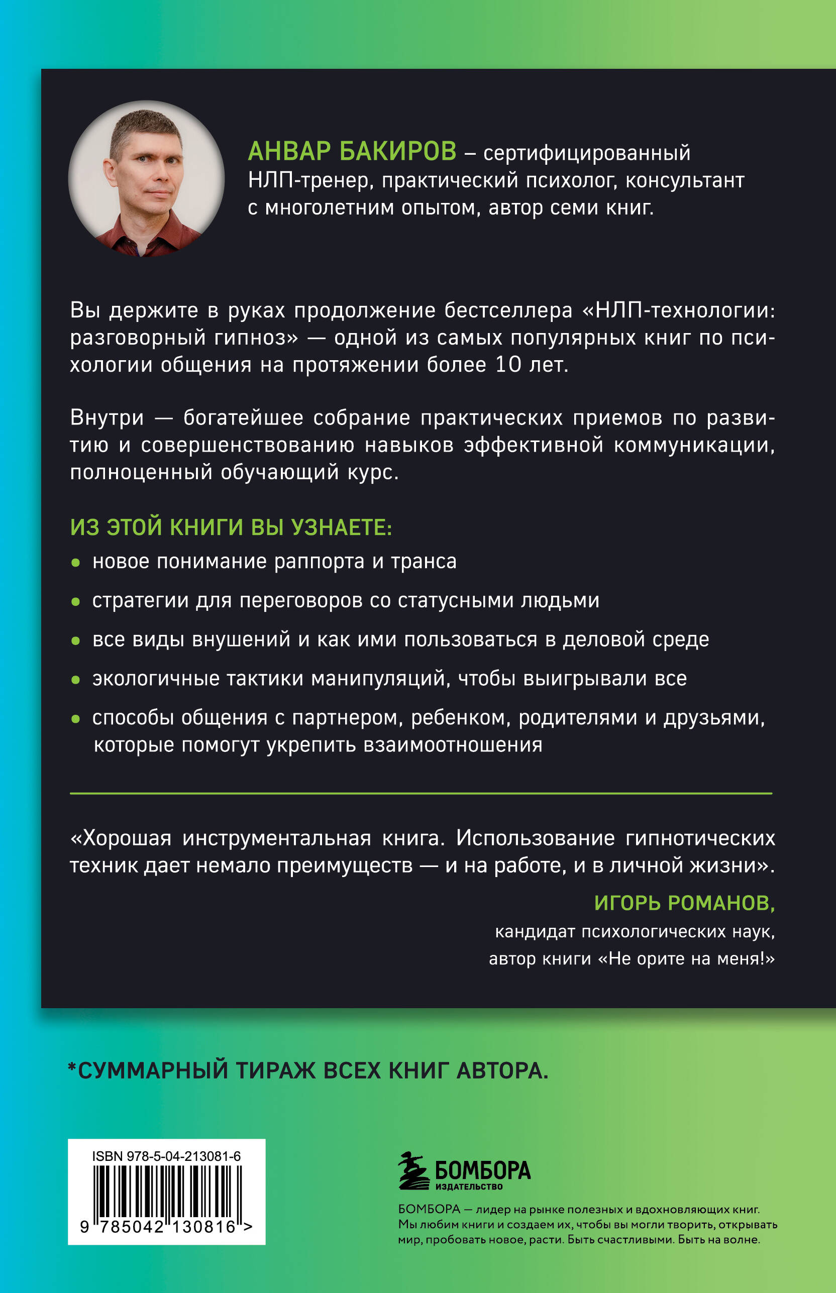 Анвар Бакиров, ведущий эксперт страны по НЛП и гипнозу, собрал в этой книге опыт работы консультантом и тренером в области эффективных коммуникаций за последние 10 лет. Это крайне полезная книга: ясная, легкая и без лишних терминов. Все в ней практично: делай - раз, делай - два и даже без три. Потому что работает только простое. Если захочешь, то научишься, автор гарантирует. Его бестселлеры, такие как "Успех. Естественный отбор", "Источник красивых решений", "Как управлять собой и другими с помощью НЛП", "Игры, в которых побеждают женщины" проданы суммарным тиражом около 200 000 копий.