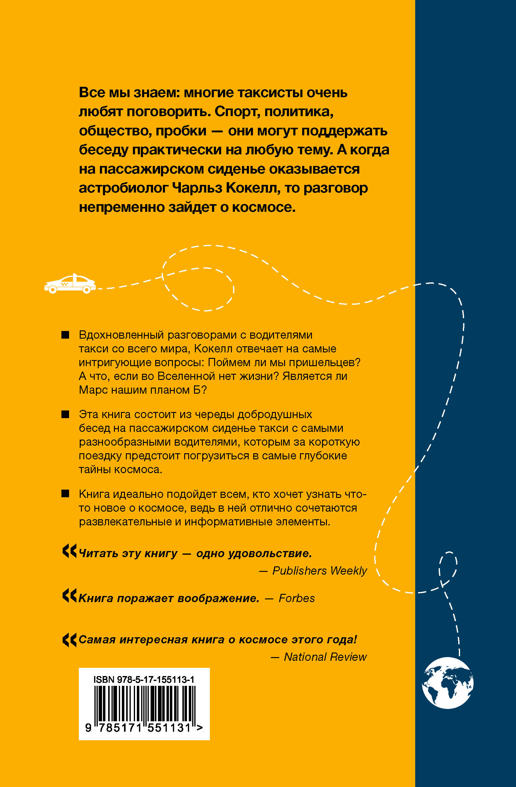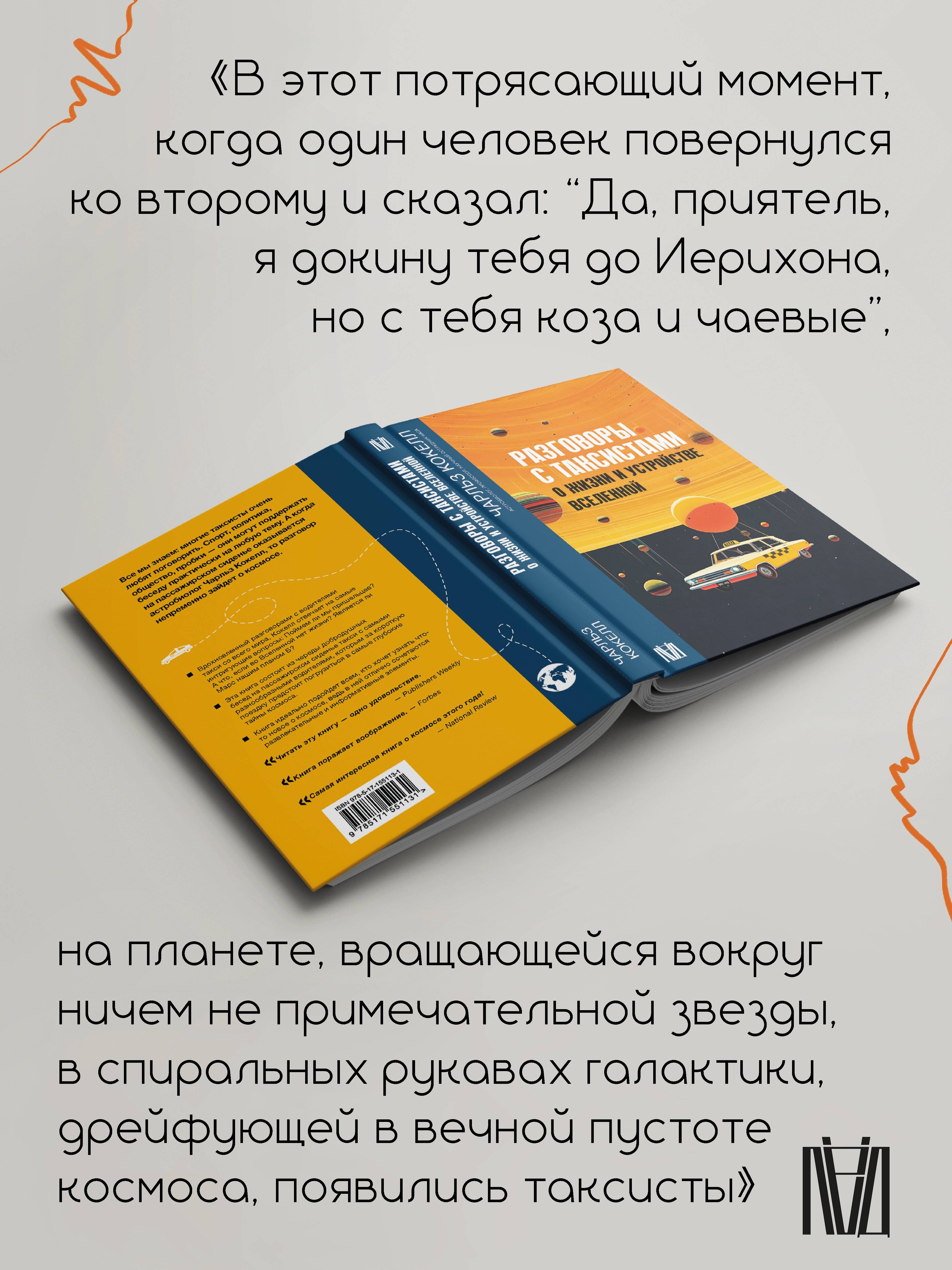 Все мы знаем: многие таксисты очень любят поговорить. Спорт, политика, общество, пробки - они могут поддержать беседу практически на любую тему. А когда на пассажирском сиденье оказывается астробиолог Чарльз Кокелл, то разговор непременно зайдет о космосе. Вдохновленный разговорами с водителями такси со всего мира, Кокелл отвечает на самые интригующие вопросы: Поймем ли мы пришельцев? А что, если во Вселенной нет жизни? Является ли Марс нашим планом Б? Эта книга состоит из череды добродушных бесед на пассажирском сиденье такси с самыми разнообразными водителями, которым за короткую поездку предстоит погрузиться в самые глубокие тайны космоса.| Издательство | ИЗДАТЕЛЬСТВО "АСТ" |