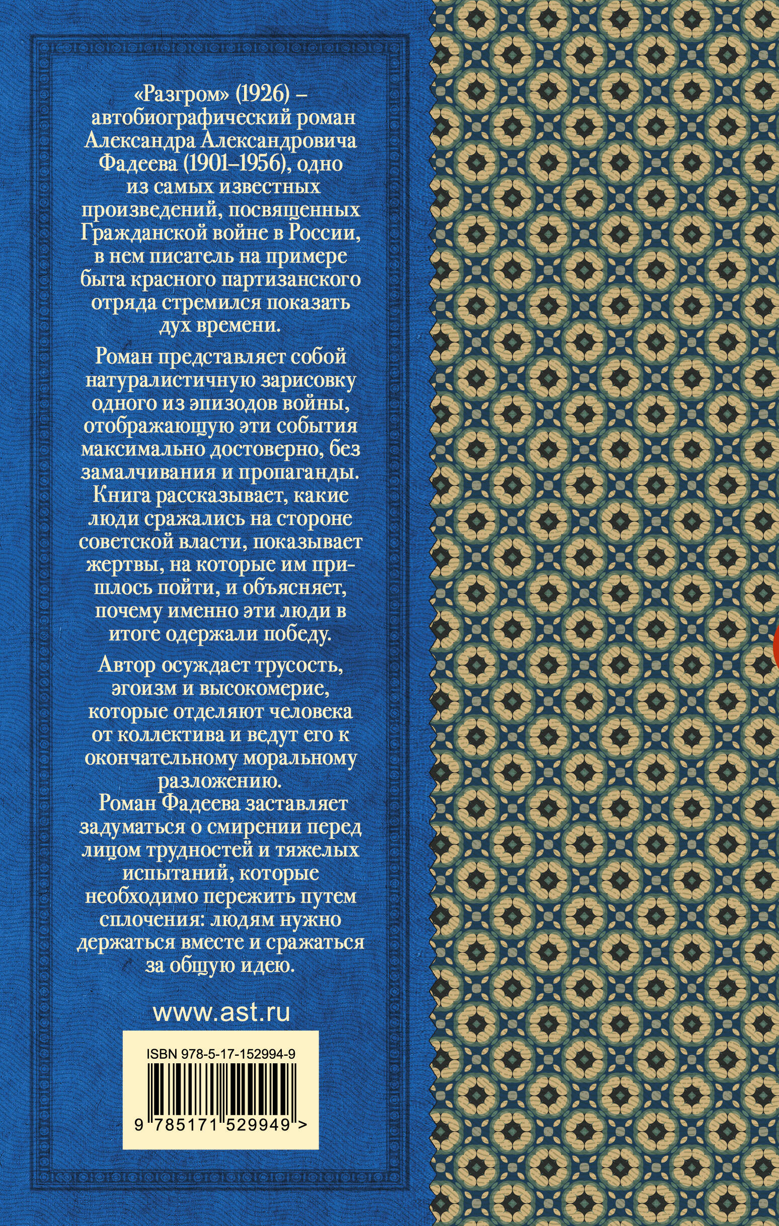 "Разгром" (1926) - автобиографический роман Александра Александровича Фадеева (1901-1956), одно из самых известных произведений, посвященных Гражданской войне в России, в нем писатель на примере быта красного партизанского отряда стремился показать дух времени. Роман представляет собой натурали стичную зарисовку одного из эпизодов войны, отображающую эти события максимально достоверно, без замалчивания и пропаганды. Книга рассказывает, какие люди сражались на стороне советской власти, показывает жертвы, на которые им пришлось пойти, и объясняет, почему именно эти люди в итоге одержали победу. Автор осуждает трусость, эгоизм и высокомерие, которые отделяют человека от коллектива и ведут егок окончательному моральному разложению. Роман Фадеева заставляет задуматься о смирении перед лицом трудностей и тяжелых испытаний, которые необходимо пережить путем сплочения: людям нужно держаться вместе и сражаться за общую идею.