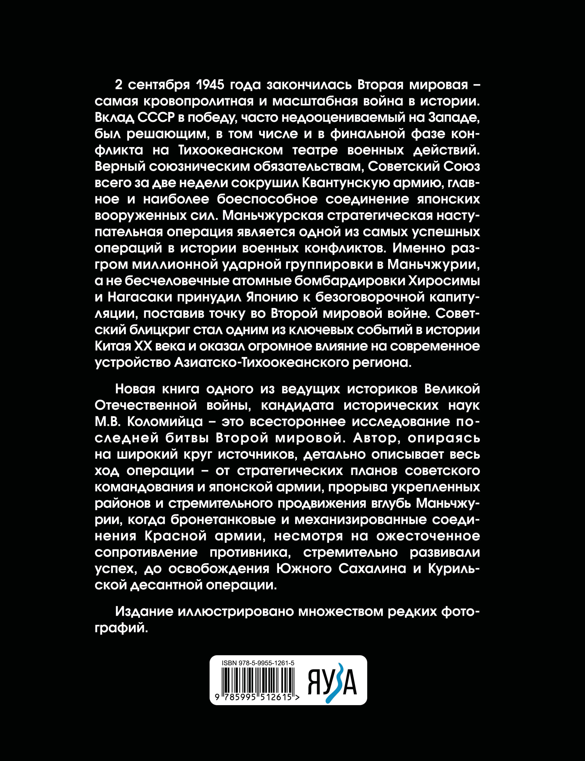 2 сентября 1945 года закончилась Вторая Мировая - самая кровопролитная и масштабная война в истории. Вклад СССР в победу, часто недооцениваемый на Западе, был решающим, в том числе и в финальной фазе конфликта на Тихоокеанском театре военных действий. Верный союзническим обязательствам, Советский Союз всего за две недели сокрушил Квантунскую армию, главное и наиболее боеспособное соединение японских вооруженных сил. Маньчжурская стратегическая наступательная операция является одной из самых успешных операций в истории военных конфликтов. Именно разгром миллионной ударной группировки в Маньчжурии, а не бесчеловечные атомные бомбардировки Хиросимы и Нагасаки, принудил Японию к безоговорочной капитуляции, поставив точку во Второй Мировой войне. Советский блицкриг стал одним из ключевых событий в истории Китая XX века и оказал огромное влияние на современное устройство Азиатско-Тихоокеанского региона. Новая книга одного из ведущих историков Великой Отечественной войны, кандидата исторических наук М.В. Коломийца - это всестороннее исследование последней битвы Второй Мировой. Автор, опираясь на широкий круг источников, детально описывает весь ход операции - от стратегических планов советского командования и японской армии, прорыва укрепленных районов и стремительного продвижения вглубь Маньчжурии, когда бронетанковые и механизированные соединения Красной Армии, несмотря на ожесточенное сопротивление противника, стремительно развивали успех, до освобождения Южного Сахалина и Курильской десантной операции. Издание иллюстрировано множеством редких фотографий.| Издательство | Яуза-пресс ООО |