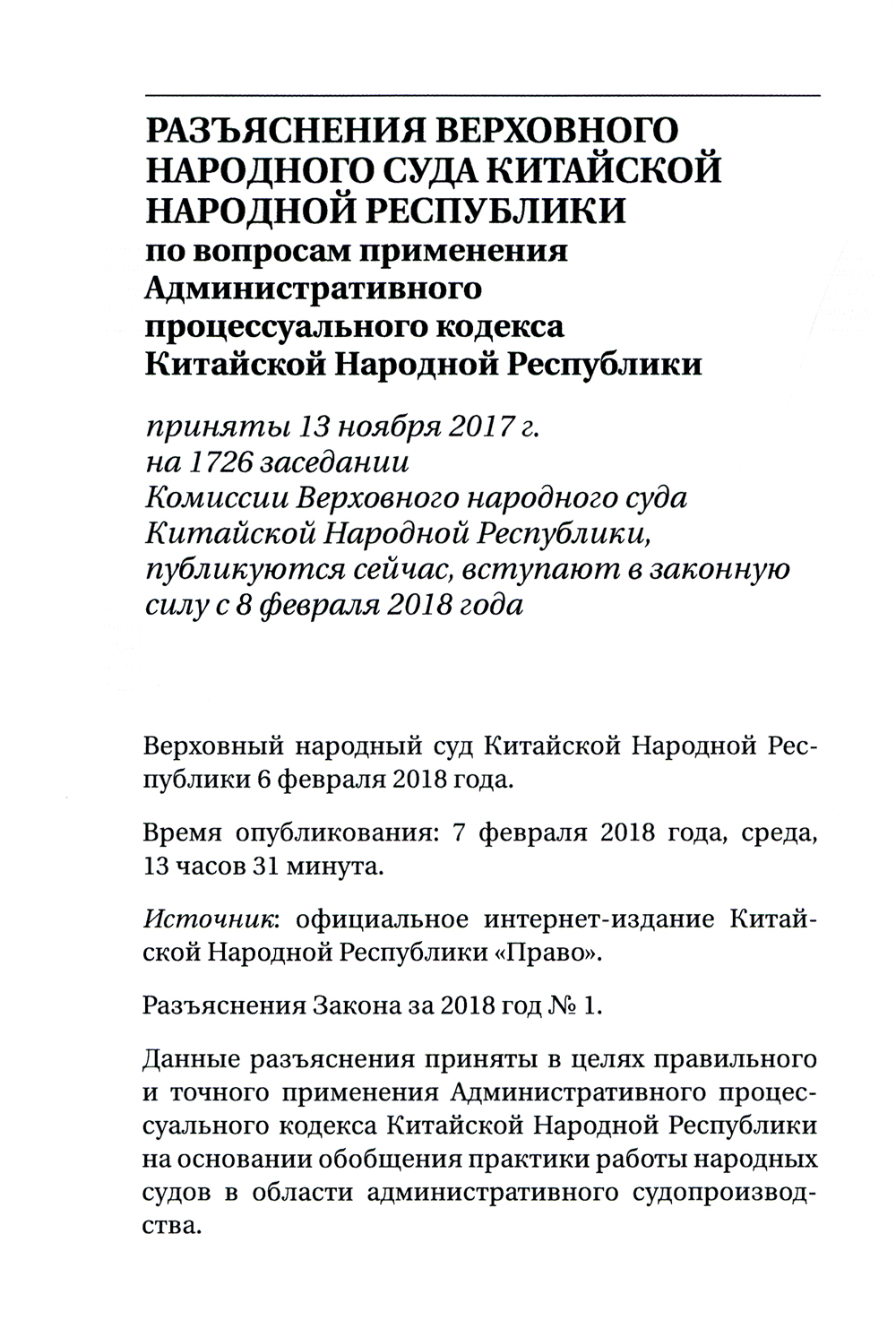 Разъяснения Верховного народного суда КНР по вопросам применения Административного процессуального кодекса КНР: монография