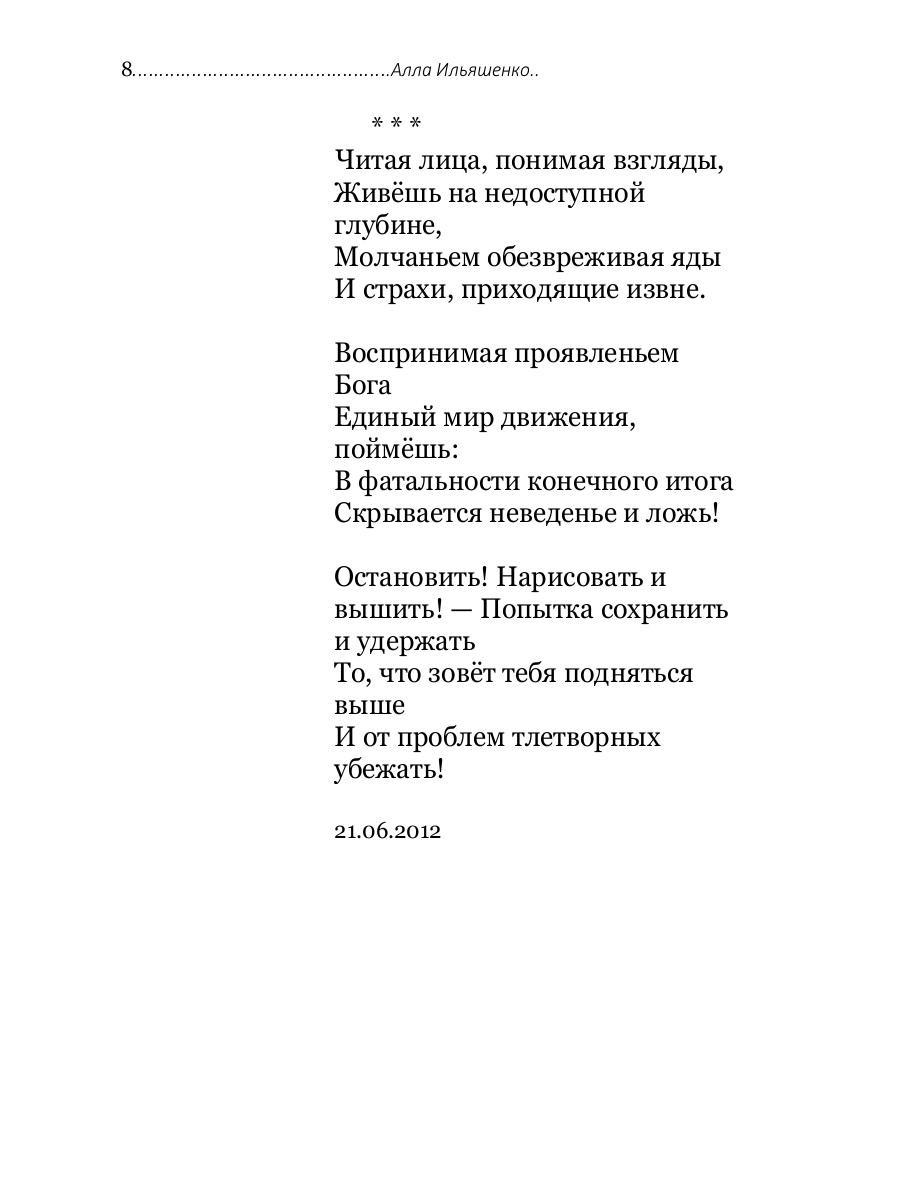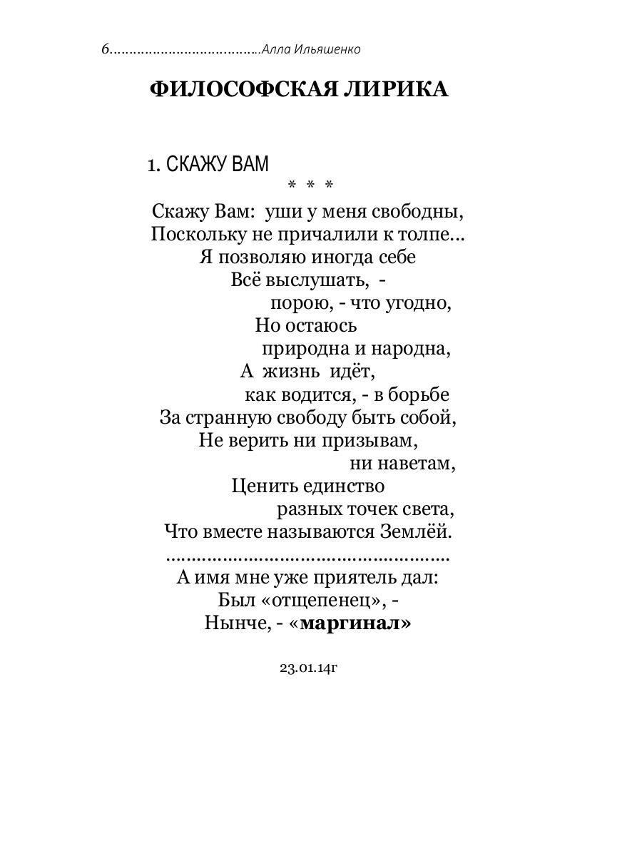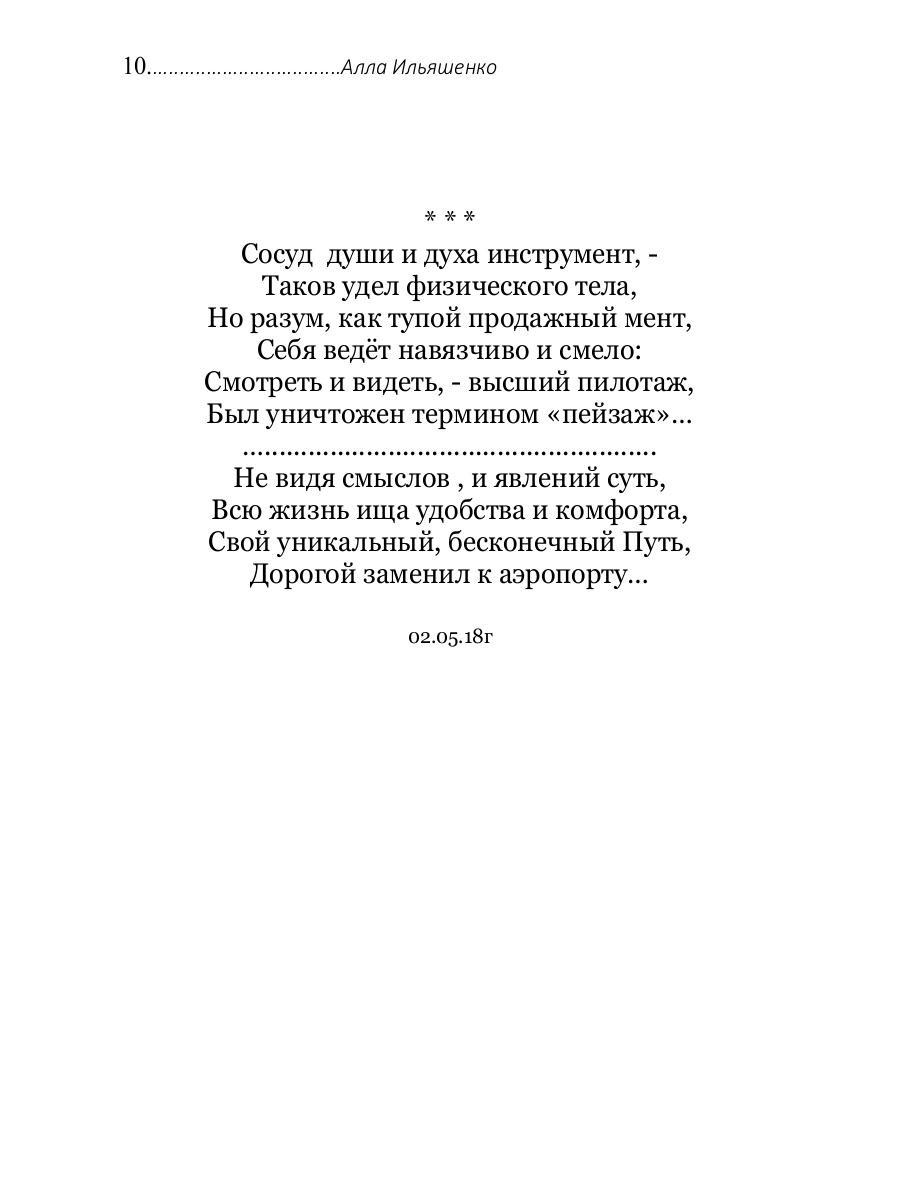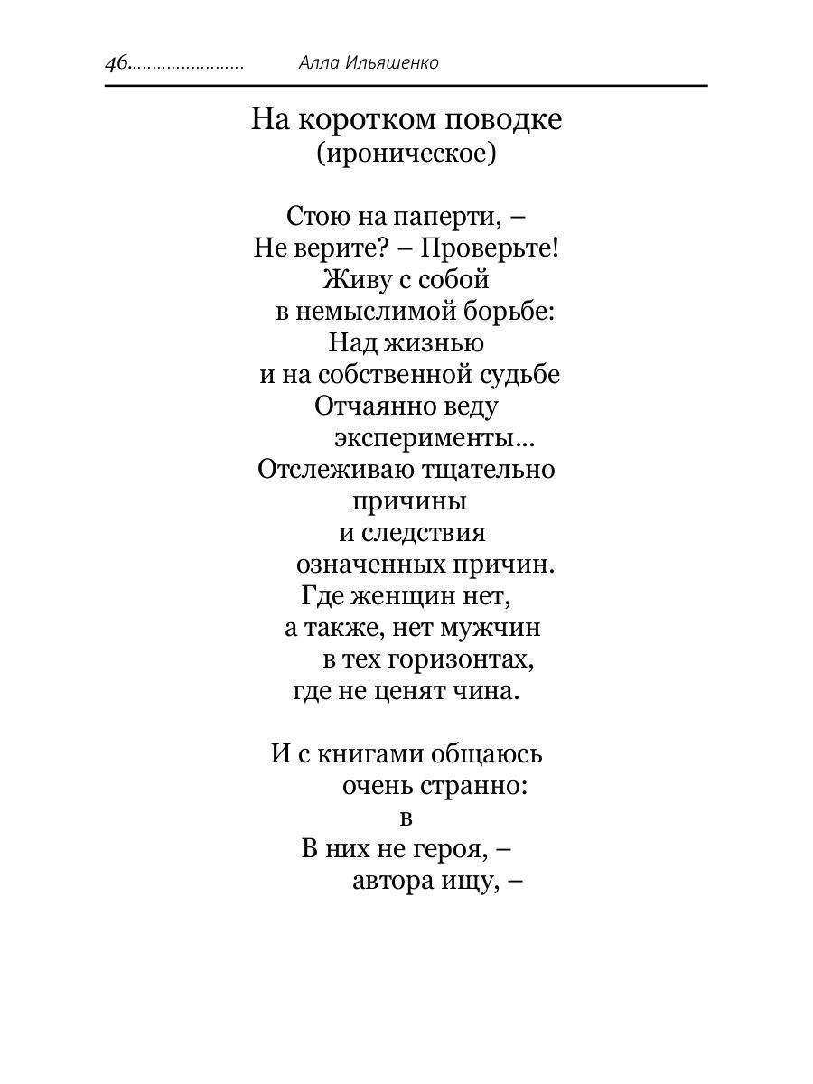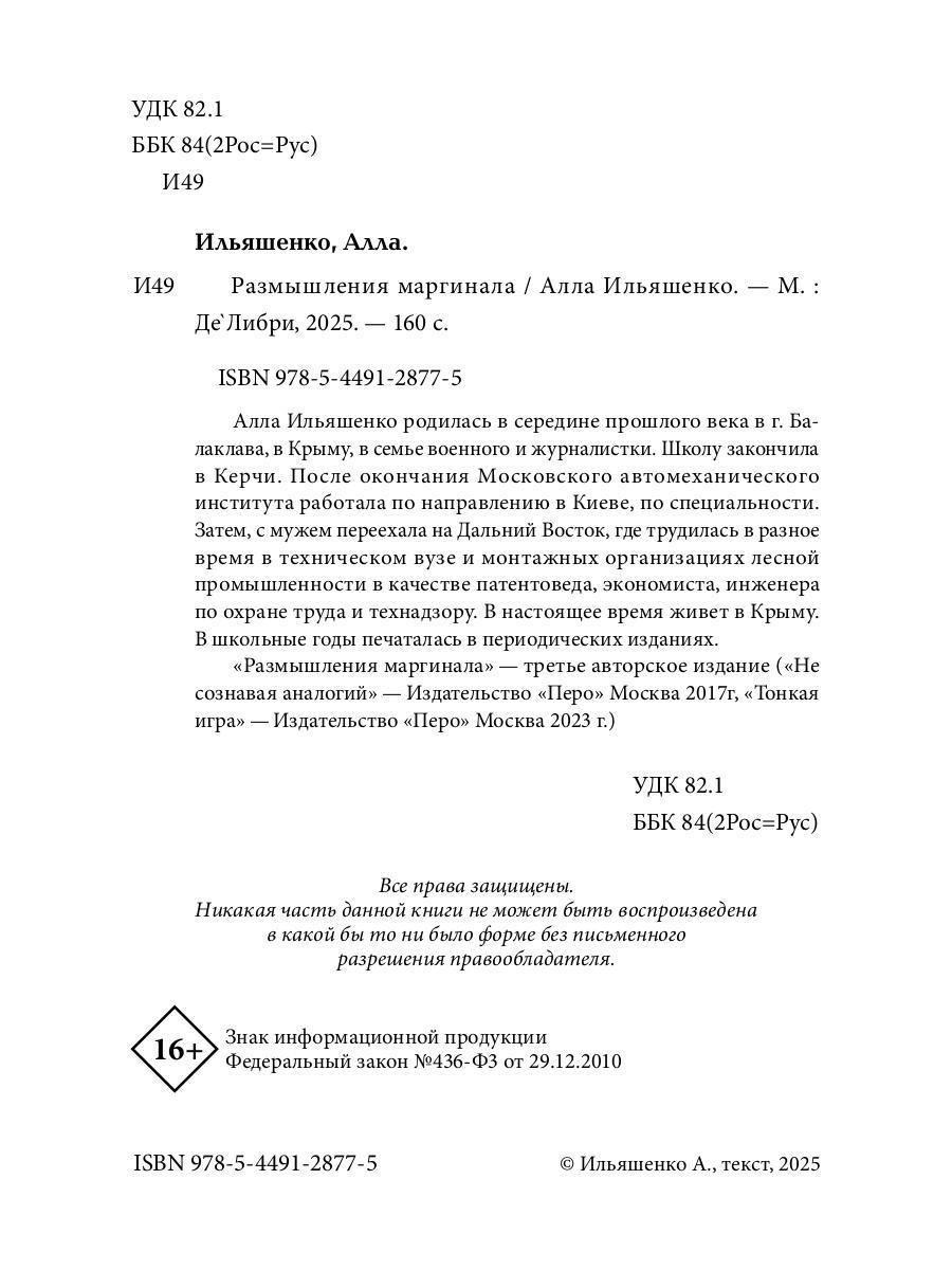 Алла Ильяшенко родилась в середине прошлого века в г. Балаклава, в Крыму, в семье военного и журналистки. Школу закончила в Керчи. После окончания Московского автомеханического института работала по направлению в Киеве, по специальности. Затем, с мужем переехала на Дальний Восток, где трудилась в разное время в техническом вузе и монтажных организациях лесной промышленности в качестве патентоведа, экономиста, инженера по охране труда и технадзору. В настоящее время живет в Крыму. В школьные годы печаталась в периодических изданиях. «Размышления маргинала» - третье авторское издание («Не сознавая аналогий» - Издательство «Перо» Москва 2017г, «Тонкая игра» - Издательство «Перо» Москва 2023г.)| Издательство | Рипол Классик |