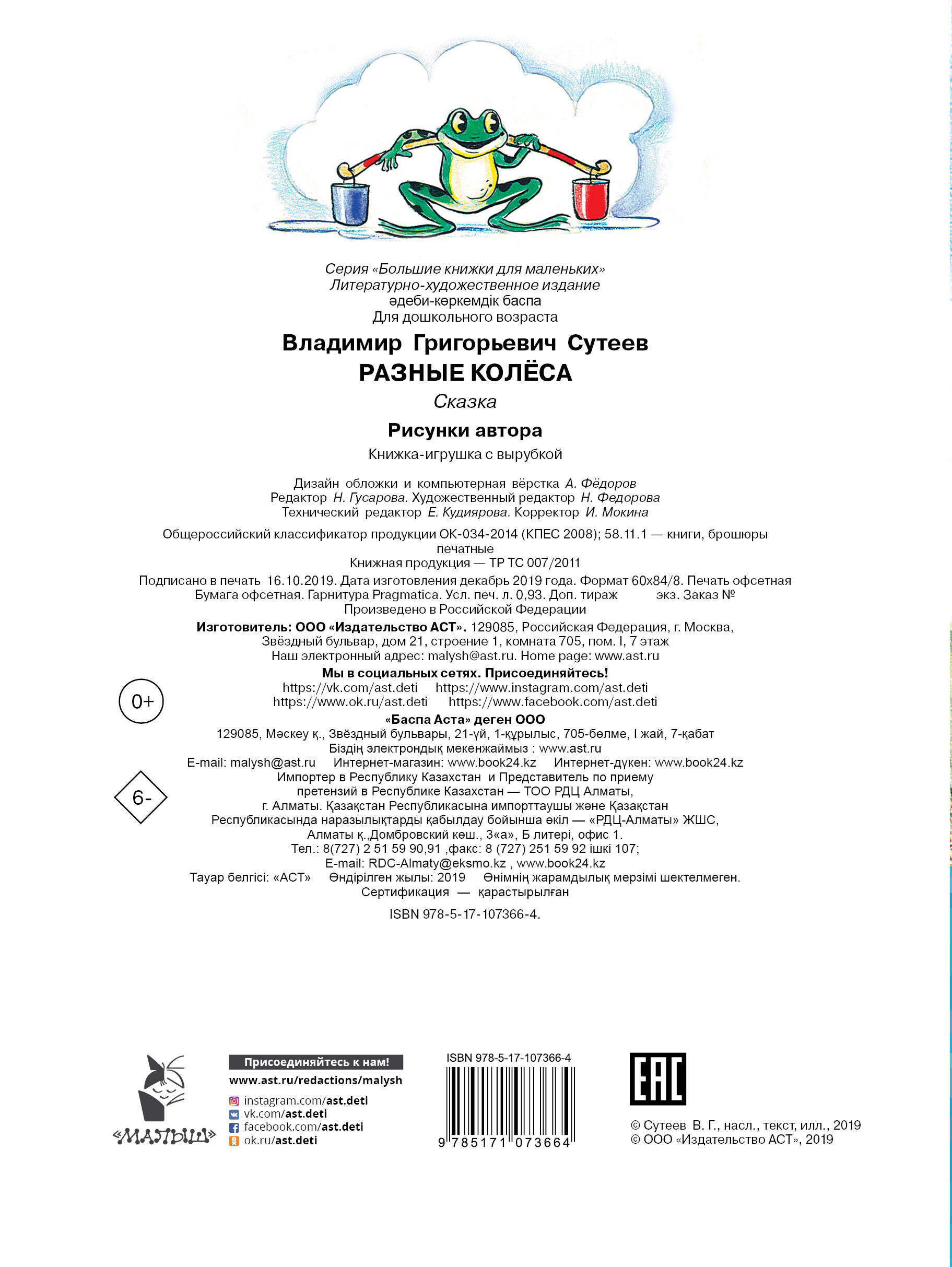 Нашли раз друзья-зверята телегу, а у неё все колёса разные. Ни на что не годна телега! Но друзья не растерялись, и каждый забрал себе по одному колесу. А вот что они с ними сделали, ты узнаешь, прочитав эту замечательную сказку В. Сутеева!| Издательство | ИЗДАТЕЛЬСТВО "АСТ" |