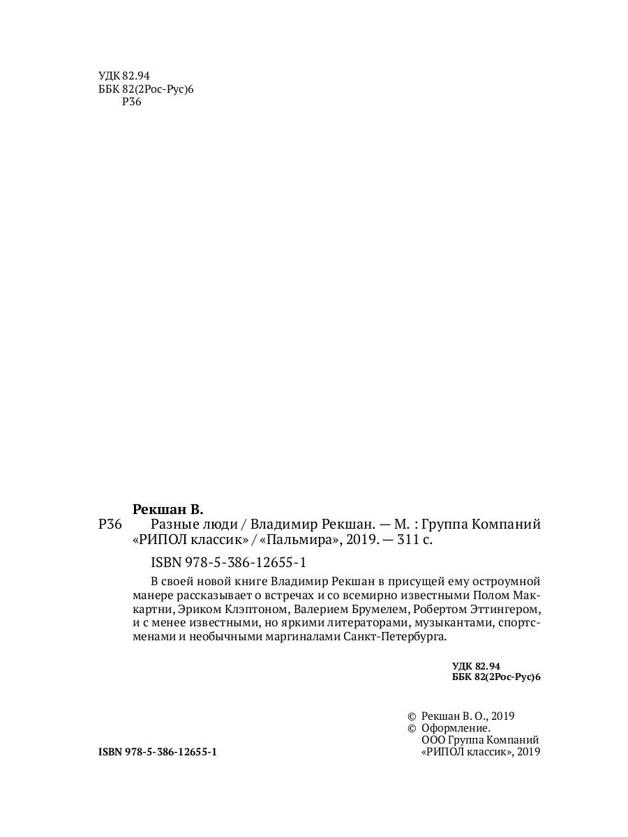 В своей новой книге Владимир Рекшан в присущей ему остроумной манере рассказывает о встречах и со всемирно известными Полом Маккартни, Эриком Клэптоном, Валерием Брумелем, Робертом Эттингером, и с менее известными, но яркими литераторами, музыкантами, спортсменами и необычными маргиналами Санкт-Петербурга.| Издательство | Рипол Классик |