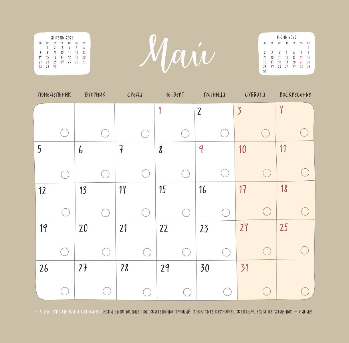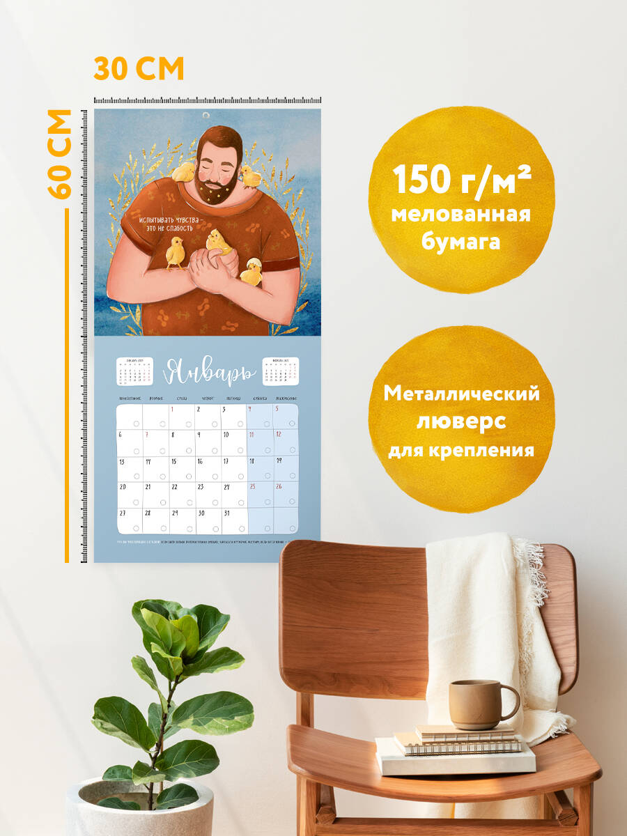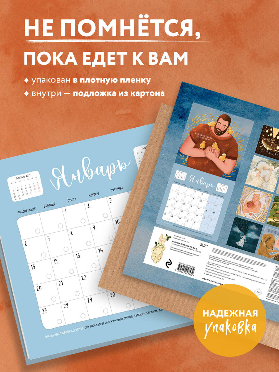 Календарь с иллюстрациями художницы Дарьи Крюковой. Отличный подарок подруге, сестре, маме, дочери. Каждый разворот дополнен поддерживающей фразой из книги Юлии Булгаковой «Разреши себе чувствовать». Внутри трекер эмоций: в сетке можно помечать, какие эмоции преобладали каждый день - позитивные или негативные. Наши настенные календари отличаются высоким качеством исполнения! Тщательно подобранные иллюстрации, напечатанные на глянцевой бумаге высочайшего качества, станут настоящим украшением дома, а в календарной сетке найдется место для ваших планов: большие клетки позволят делать записи и организовать свой год! В серии настенных календарей издательства «ЭКСМО» каждый найдет тему по вкусу: великие художники, великолепные подборки с самыми знаменитыми произведениями искусства, легендарные кинематографические саги и игры, главные книжные авторы и бестселлеры, фотографии и иллюстрации любимых животных и многое-многое другое! Календарь с иллюстрациями художницы Дарьи Крюковой. Отличный подарок подруге, сестре, маме, дочери. Каждый разворот дополнен поддерживающей фразой из книги Юлии Булгаковой «Разреши себе чувствовать». Внутри трекер эмоций: в сетке можно помечать, какие эмоции преобладали каждый день - позитивные или негативные. Технические параметры: - Тип календаря - настенный перекидной. - Год - 2024. - Календарная сетка - с разбивкой по месяцам. - Вид скрепления - скрепка. - Ширина - 30 см. - Высота - 30 см. - Внутренний блок - мелованная бумага 150 г/м2. - Подложка - плотный гофрокартон для поддержания формы. - Индивидуальная упаковка в плотный целлофановый пакет.| Издательство | ООО "Издательство "Эксмо" |