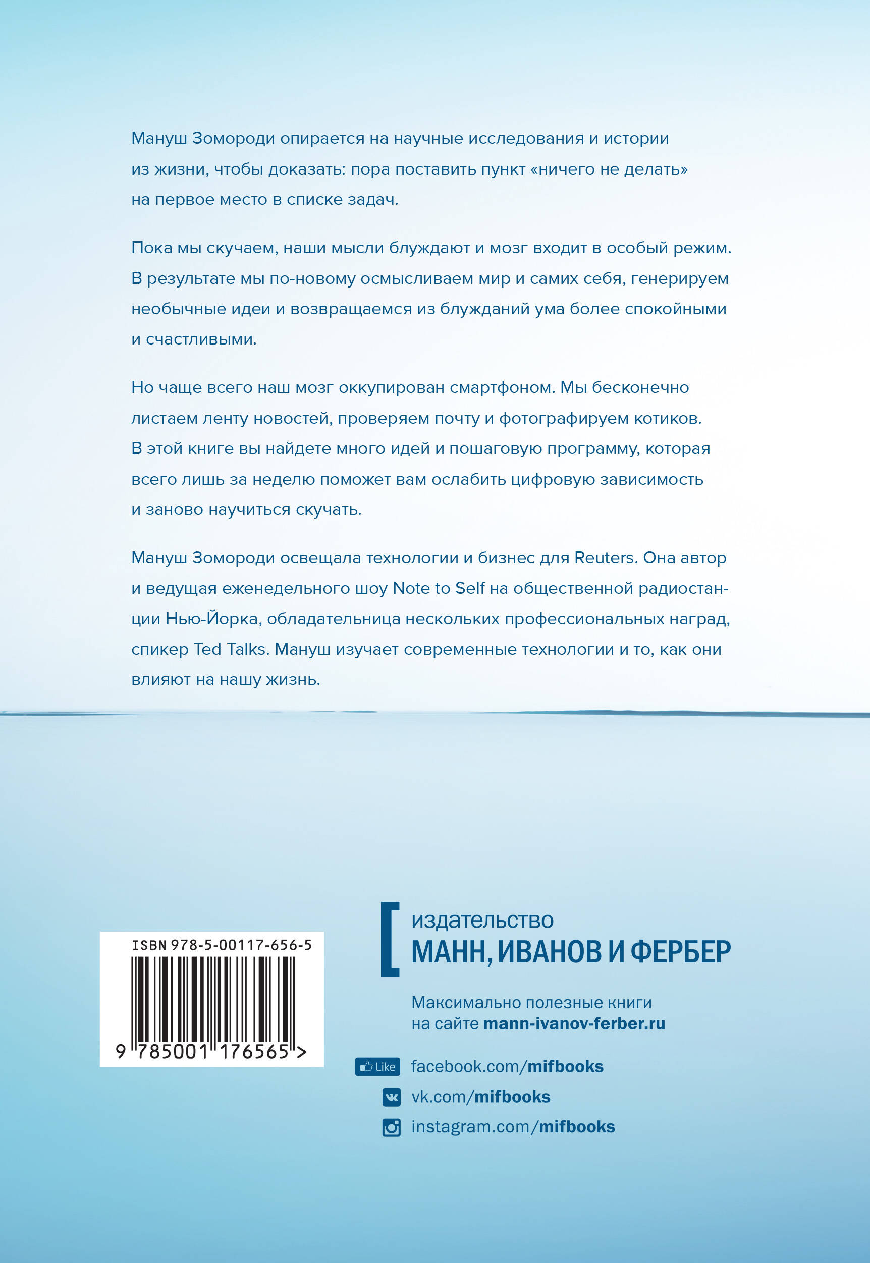 Смартфона и вечный он-лайн не дают нам скучать, хотя скука необходима нашему мозгу. Эта книга о том, как гаджеты и "цифра" влияют на нас и как уменишить цифровую зависимость, чтобы раскрыть потенциал мозга и быть креативными.| Издательство | МАНН, ИВАНОВ И ФЕРБЕР ООО |