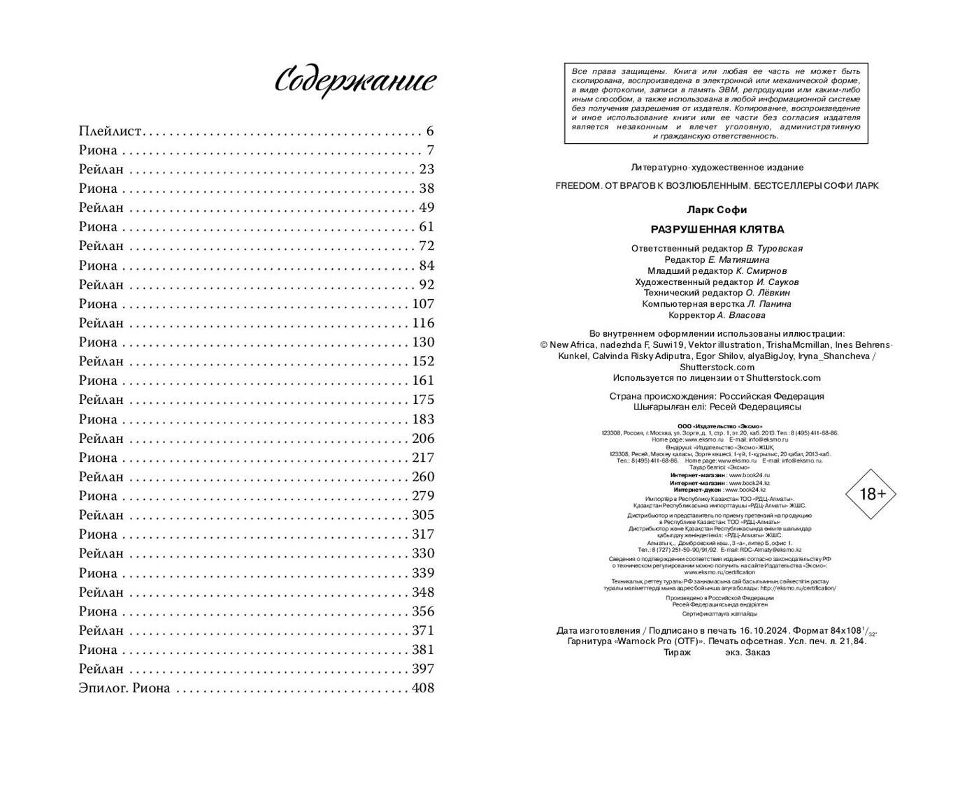 Долгожданное продолжение цикла «От врагов к возлюбленным», жаркий и чувственный роман о мафии от автора бестселлеров Amazon Софи Ларк! Невероятно захватывающий и пленительный роман в ковбойском антураже. Риона Гриффин идеальна, если не считать того факта, что на дух меня не переносит. Она считает, что ей никто не нужен. Но Риона ошибается. Ей нужен я. За ней охотится тот, кто не привык проигрывать. Когда Риону пытались утопить в собственном доме, меня попросили о помощи. Я позабочусь о ней, буду защищать днем и ночью. И пусть она считает, что хуже наказания не придумаешь, я уверен - Риона сможет проникнуться ко мне симпатией. Пусть она пообещала никогда не влюбляться, есть клятвы, которые стоит разрушить… Бестселлер BookTok теперь на русском! Еще больше мафии, интриг и страсти! Каждый роман про разную пару, их можно читать отдельно! Для фанатов Л. Дж. Шэн и Пенелопы Дуглас! Невероятное красивая обложка, напоминающая мерцающее полотно. «Нарушенная клятва» - это история о любви, что зародилась с одного взгляда. Роман о Рионе - сестре главного героя из романа «Бездушный принц». «Рейлан - обаятельный юноша с Юга, полюбивший холодную Риону с первого взгляда. Милая, забавная, страстная и опасная история любви!» - Amazon| Издательство | ООО "Издательство "Эксмо" |
