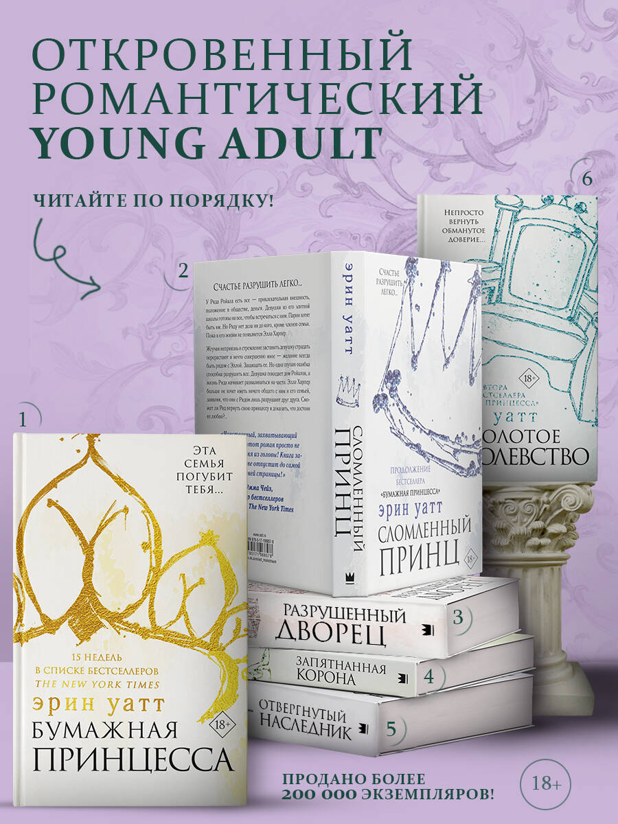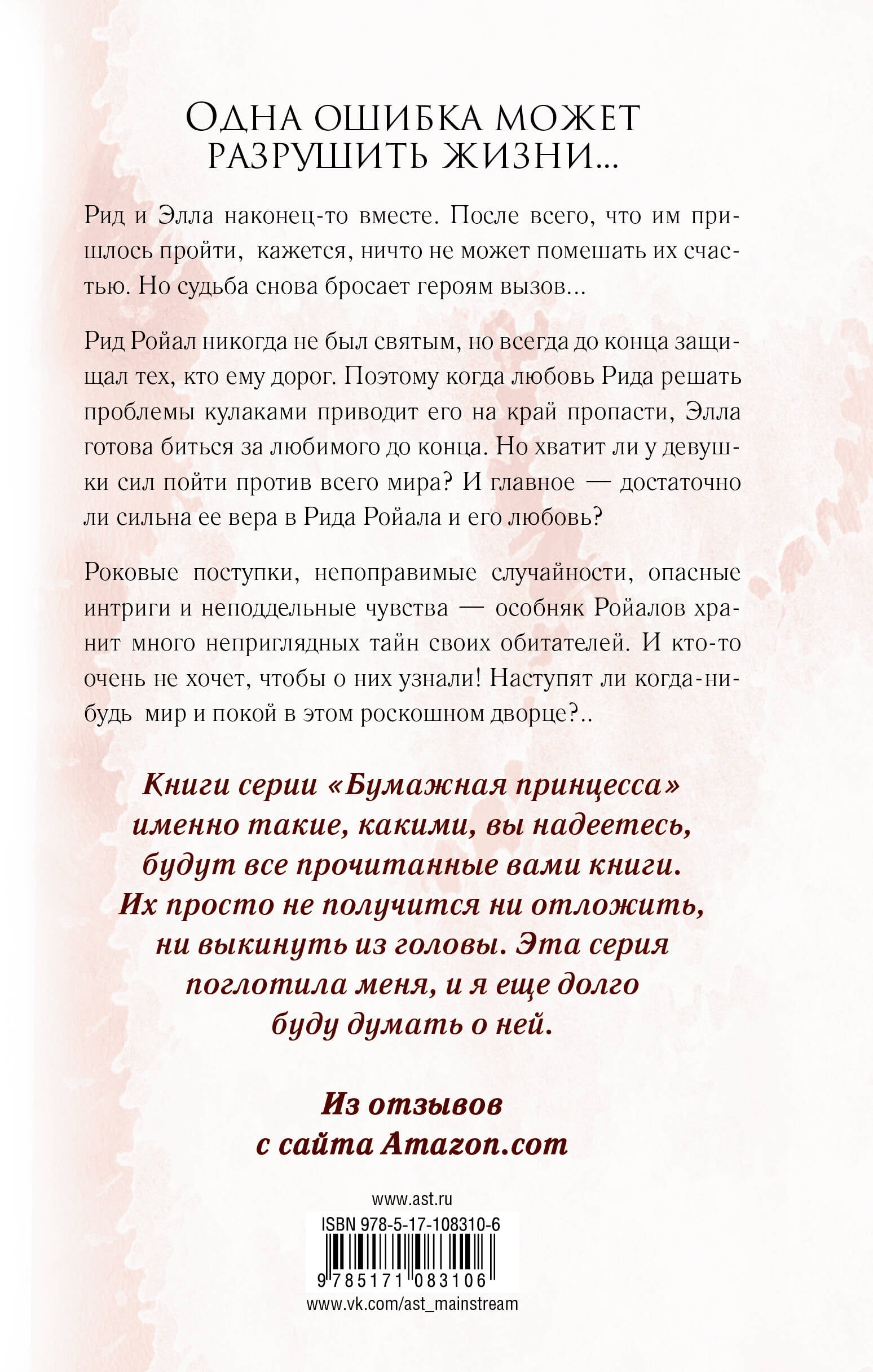 Третья книга бестселлера Эрин Уатт "Бумажная принцесса". Одна ошибка может стоить жизни... Рид и Элла наконец-то вместе. После всего, что им пришлось пройти, кажется, ничто не может помешать их счастью. Но судьба снова бросает героям вызов... Когда любовь Рида Ройала решать проблемы кулаками приводит его на край пропасти, Элла Харпер готова до конца биться за любимого. Но хватит ли у девушки сил пойти против всего мира? И главное - достаточно ли сильна ее вера в Рида и его любовь? Роковые поступки, непоправимые случайности, опасные интриги и неподдельные чувства - особняк Ройалов, как всегда, держит в напряжении своих обитателей. Наступят ли когда-нибудь мир и покой в этом роскошном дворце?..| Издательство | ИЗДАТЕЛЬСТВО "АСТ" |