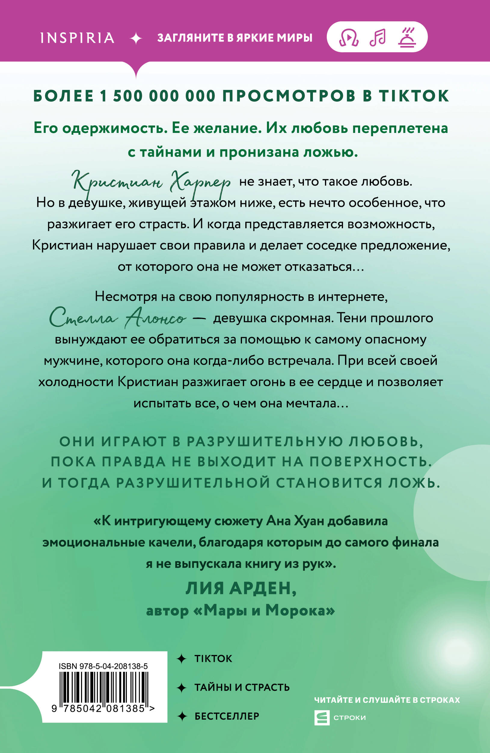 Они играют в разрушительную любовь, пока правда не выходит на поверхность. И тогда разрушительной становится ложь. Финал самого продаваемого романтического цикла года. Абсолютный хит TikTok, покоривший миллионы читательских сердец. «Разрушительная ложь» - четвертая, заключительная книга цикла Аны Хуан TWISTED. Серия рассказывает о четырех очень разных подругах, каждая из которых обретает любовь. Одна книга - одна история любви. Идеально для любителей романов Моны Кастен и Л. Дж. Шэн. Покет большого формата, запечатанные клапаны с изображениями главных героев, дифракционная фольга на обложке и эксклюзивный подарок только в первом тираже. Кристиан Харпер не знает, что такое любовь. Но в девушке, живущей этажом ниже, есть нечто особенное, что разжигает его страсть. И когда представляется возможность, Кристиан нарушает свои правила и делает соседке предложение, от которого она не может отказаться… Несмотря на свою популярность в интернете, Стелла Алонсо - девушка скромная. Тени прошлого вынуждают ее обратиться за помощью к самому опасному мужчине, которого она когда-либо встречала. При всей своей холодности Кристиан разжигает огонь в ее сердце и позволяет испытать все, о чем она мечтала… «К интригующему сюжету Ана Хуан добавила эмоциональные качели, благодаря которым до самого финала я не выпускала книгу из рук». - ЛИЯ АРДЕН, автор романа «Мара и Морок»