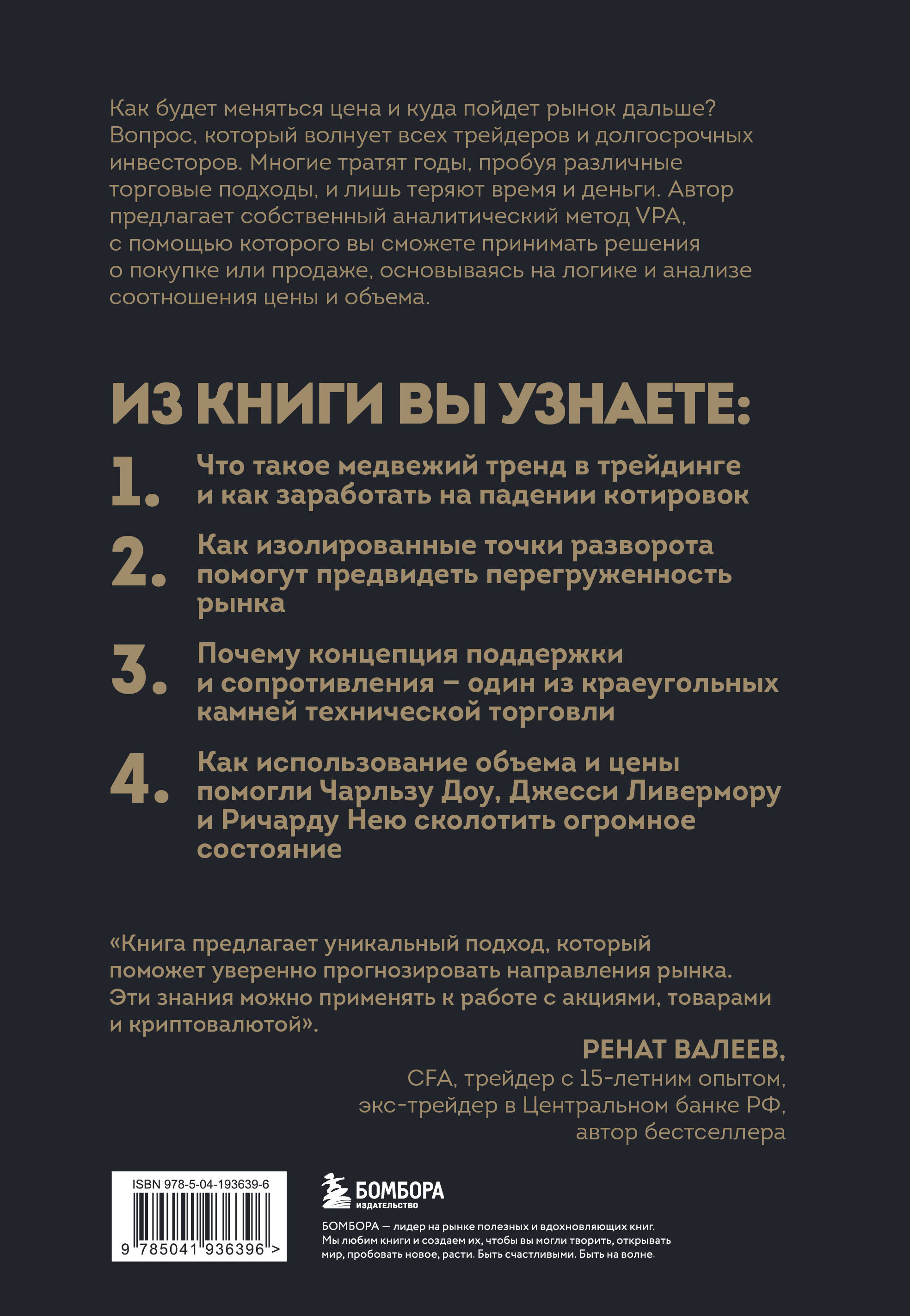 «Как будет меняться цена и куда пойдет рынок дальше?» - вопрос, который волнует всех трейдеров и долгосрочных инвесторов. Многие тратят годы, пробуя различные торговые подходы, и лишь теряют время и деньги. Автор предлагает собственный аналитический метод VPA, с помощью которого вы сможете уверенно прогнозировать направления рынка, а ваши решения о покупке или продаже будут основаны на логике и анализе соотношения цены и объема. Из книги вы узнаете: 1. Что такое медвежий тренд в трейдинге и как заработать на падении котировок. 2. Как изолированные точки разворота помогут предвидеть перегруженность рынка. 3. Почему концепция поддержки и сопротивления один из краеугольных камней технической торговли. 4. Как использование объема и цены помогли Чарльзу Доу, Джесси Ливермору и Ричарду Нею сколотить огромное состояние.| Издательство | ООО "Издательство "Эксмо" |