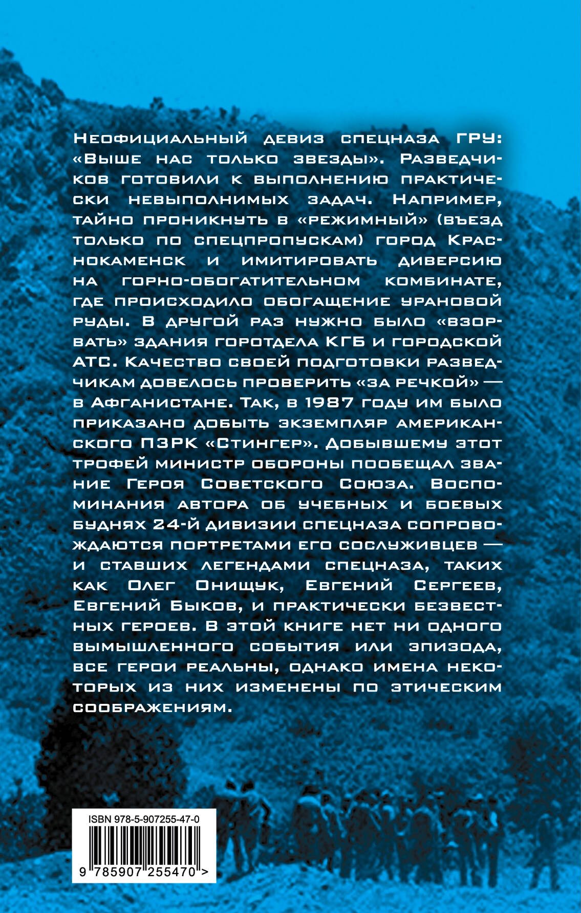 Неофициальный девиз спецназа ГРУ: «выше нас только звезды». Разведчиков готовили к выполнению практически невыполнимых задач. Например, тайно проникнуть в «режимный» (въезд только по спецпропускам) город Краснокаменск и имитировать диверсию на горно-обогатительном комбинате, где происходило обогащение урановой руды. В другой раз нужно было «взорвать» здания горотдела КГБ и городской АТС. Качество своей подготовки разведчикам довелось проверить «за речкой» - в Афганистане. Так, в 1987 году им было приказано добыть экземпляр американского ПЗРК «Стингер». Добывшему этот трофей министр обороны пообещал звание Героя Советского Союза. Воспоминания автора об учебных и боевых буднях 24-й дивизии спецназа сопровождаются портретами его сослуживцев - и ставших легендами спецназа, таких как Олег Онищук, Евгений Сергеев, Евгений Быков, и практически безвестных героев. В этой книге нет ни одного вымышленного события или эпизода, все герои реальны, однако имена некоторых из них измены по этическим соображениям.| Издательство | Родина Издательство ООО |