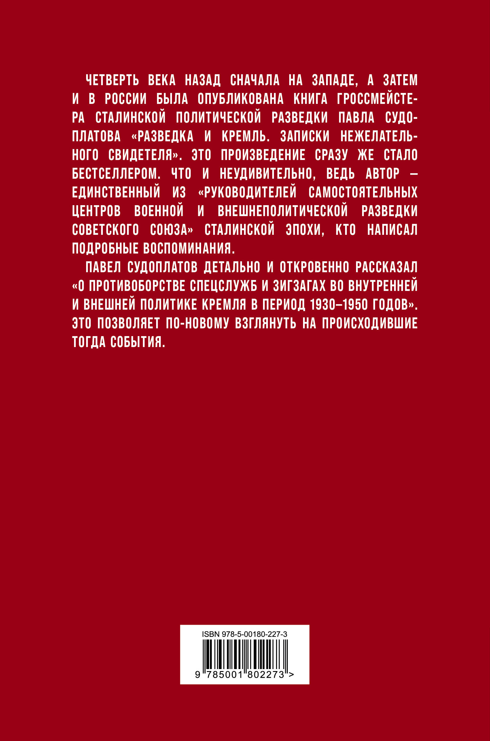 Четверть века назад, сначала на Западе, а затем и в России была опубликована книга гроссмейстера сталинской политической разведки Павла Судоплатова «Разведка и Кремль. Записки нежелательного свидетеля». Это произведение сразу же стала бестселлером. Что и не удивительно, ведь автор - единственный из «руководителей самостоятельных центров военной и внешнеполитической разведки Советского Союза» сталинской эпохи, кто написал подробные воспоминая. Павел Судоплатов подробно и откровенно рассказал «о противоборстве спецслужб и зигзагах во внутренней и внешней политике Кремля в период 1930-1950 годов». Это позволяет по-новому взглянуть на происходившие тогда события.| Издательство | Родина Издательство ООО |