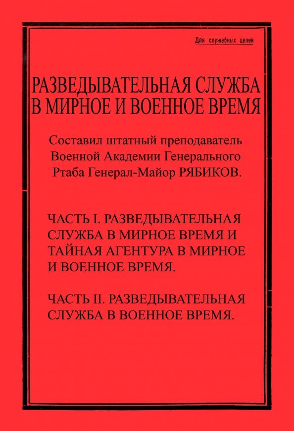 Павел Фёдорович Рябиков (1875 - 1932). Сын подполковника. Окончил Полоцкий кадетский корпус (1893), Константиновское артиллерийское училище (1896) и Николаевскую академию Генерального штаба (1901). Служил в Лейб-гвардии Финляндском полку, в артиллерийской бригаде, в штабе 3-го армейского корпуса. Участник русско-японской войны, офицер штаба 2-й Маньчжурской армии. С 1906 года служил в Главном управлении Генштаба. В 1910-14 годах - заведующий обучением Академии Генштаба. Участник Первой мировой войны. Служил в разведотделении штаба 2-й армии, начальник разведотделения штаба Северного фронта, командовал пехотным полком. В 1917 году служил в Главном управлении Генштаба. С декабря 1917 года - на штабной работе в Красной армии. Участник Белого движения на Восточном фронте с лета 1918 года. Преподавал в I военной академии, с мая 1919 года 2-й генерал-квартирмейстер Ставки, начальник штаба Восточного фронта. Участник Сибирского Ледяного похода. С марта 1920 года - представитель атамана Г. М. Семенова в Китае и Японии. В эмиграции жил сначала в Китае, с 1927 года в Чехословакии. Преподаватель в Русском народном университете в Праге, член учебного комитета Высших военно-учебных курсов генерала Н. Н. Головина. Признан крупным специалистом в области теоретических разработок по организации разведки. Тираж 30 экз. выполнен по технологии print-on-demand.
