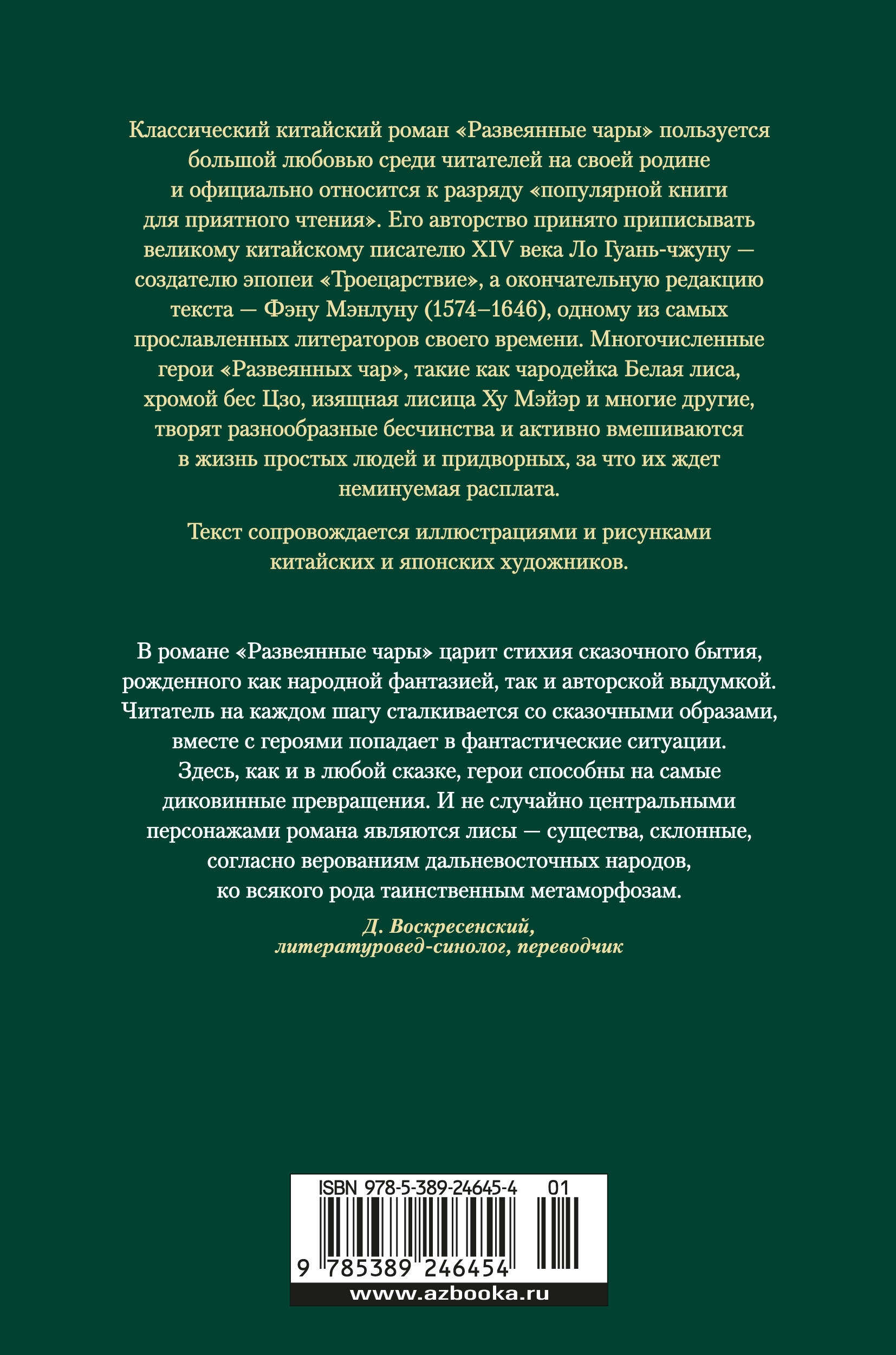 Классический китайский роман "Развеянные чары" пользуется большой любовью среди читателей на своей родине и официально относится к разряду "популярной книги для приятного чтения". Его авторство принято приписывать великому китайскому писателю XIV века Ло Гуань-чжуну - создателю эпопеи "Троецарствие", а окончательную редакцию текста - Фэну Мэнлуну (1574-1646), одному из самых прославленных литераторов своего времени. Многочисленные герои "Развеянных чар", такие как чародейка Белая лиса, хромой бес Цзо, изящная лисица Ху Мэйэр и многие другие, творят разнообразные бесчинства и активно вмешиваются в жизнь простых людей и придворных, за что их ждет неминуемая расплата. Текст сопровождается иллюстрациями и рисунками китайских и японских художников.