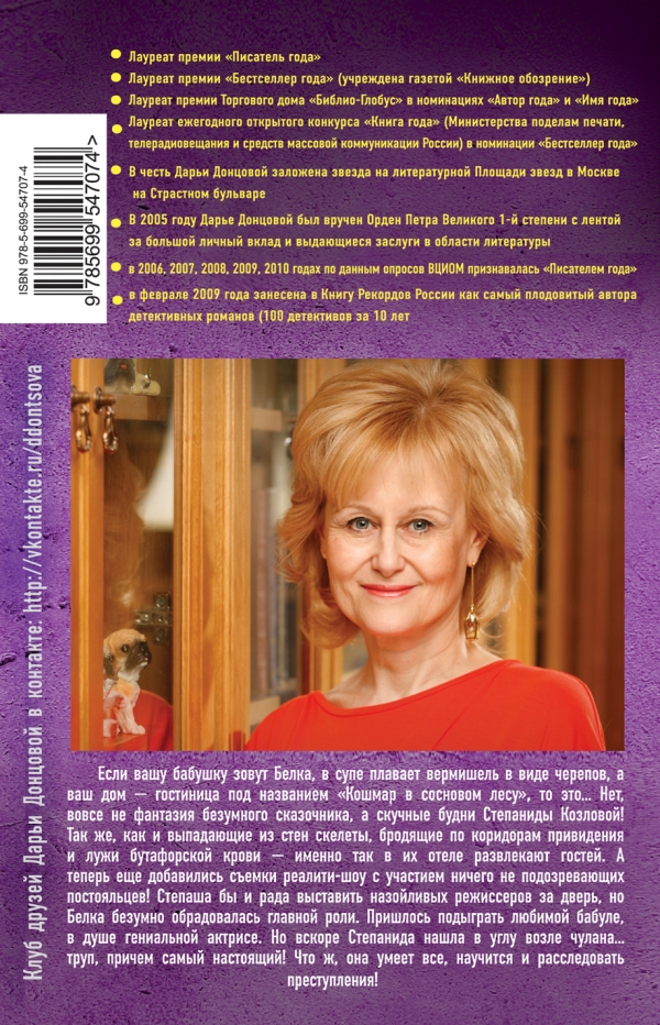 Если вашу бабушку зовут Белка, в супе плавает вермишель в виде черепов, а ваш дом - гостиница под названием «Кошмар в сосновом лесу», то это… Нет, вовсе не фантазия безумного сказочника, а скучные будни Степаниды Козловой! Так же, как и выпадающие из стен скелеты, бродящие по коридорам привидения и лужи бутафорской крови - именно так в их отеле развлекают гостей. А теперь еще добавились съемки реалити-шоу с участием ничего не подозревающих постояльцев! Степаша бы и рада выставить назойливых режиссеров за дверь, но Белка безумно обрадовалась главной роли. Пришлось подыграть любимой бабуле, в душе гениальной актрисе. Но вскоре Степанида нашла в углу возле чулана… труп, причем самый настоящий! Что ж, она умеет все, научится и расследовать преступления!