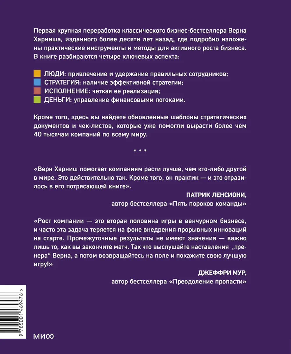 Первая крупная переработка классического бизнес-бестселлера Верна Харниша, изданного более десяти лет назад, где подробно изложены практические инструменты и методы для активного роста бизнеса. В книге разбираются четыре ключевых аспекта: ЛЮДИ: привлечение и удержание правильных сотрудников; СТРАТЕГИЯ: наличие эффективной стратегии; ИСПОЛНЕНИЕ: четкая ее реализация; ДЕНЬГИ: управление финансовыми потоками. Кроме того, здесь вы найдете обновленные шаблоны стратегических документов и чек-листов, которые уже помогли вырасти более 40 000 компаний по всему миру.| Издательство | Манн, Иванов и Фербер |
