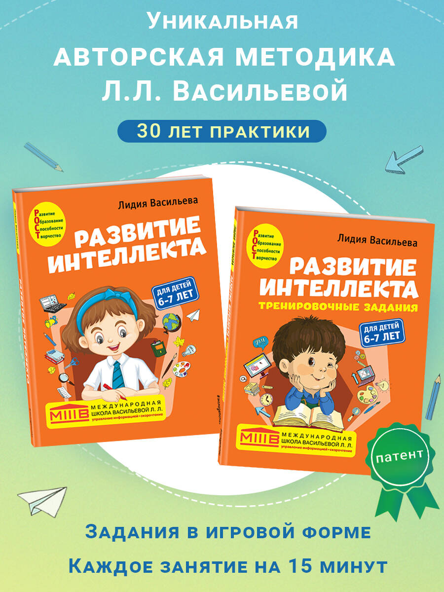 В основу книг, входящих в комплект «Развитие интеллекта (пособие + рабочая тетрадь): для детей 6-7 лет» положена авторская методика Л.Л. Васильевой, получившая свидетельства, выданные Российским авторским обществом, Бюро регистрации авторских прав США, Канадским управлением интеллектуальной собственности, апробированная в сети Школ скорочтения и управления информацией и показавшая высокие результаты по всему миру. По программе Л.Л. Васильевой официально работают более чем в 150 школах в 89 городах России и Европы. Благодаря тщательно проработанной и апробированной на практике методике ребёнок быстро научится сравнивать, запоминать, обрабатывать, систематизировать и комбинировать информацию. Именно эти навыки позволят ему раскрыть все свои таланты и успешно учиться в школе.