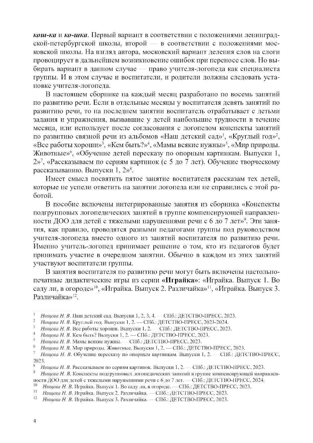 В пособии представлены подробные конспекты занятий воспитателей по развитию речи в подготовительной к школе группе для детей с ТНР (ОНР). Конспекты воспитателя тесно связаны с конспектами учителя-логопеда группы, так как воспитатель закрепляет на своих занятиях навыки и умения, уже сформированные учителем-логопедом. В конспекты не включен такой раздел, как подготовка к обучению грамоте, так как в группе компенсирующей направленности этим направлением занимается учитель-логопед. Рекомендовано воспитателям групп компенсирующей и комбинированной направленности ДОО для детей с ТНР (ОНР).| Издательство | Детство-Пресс |