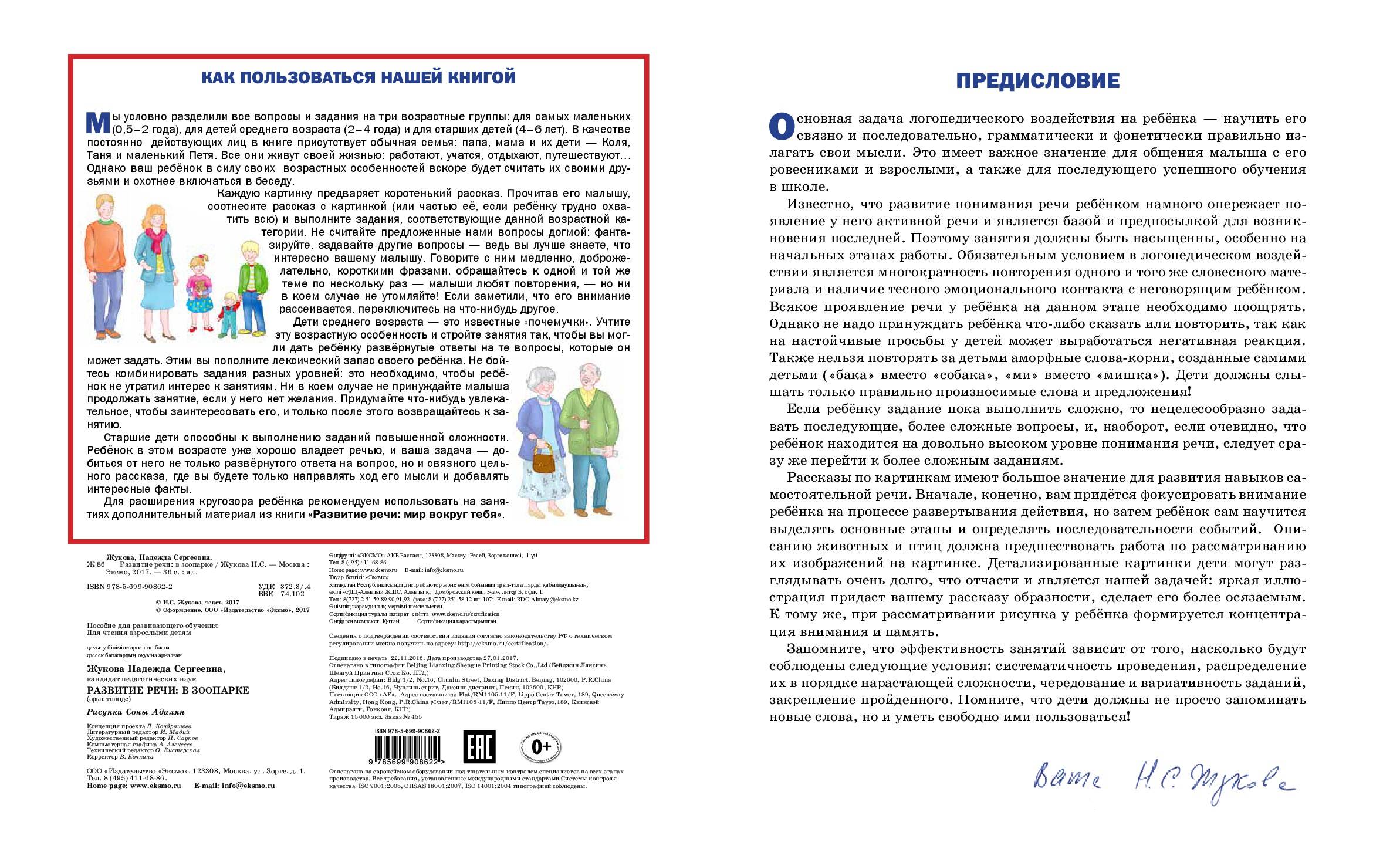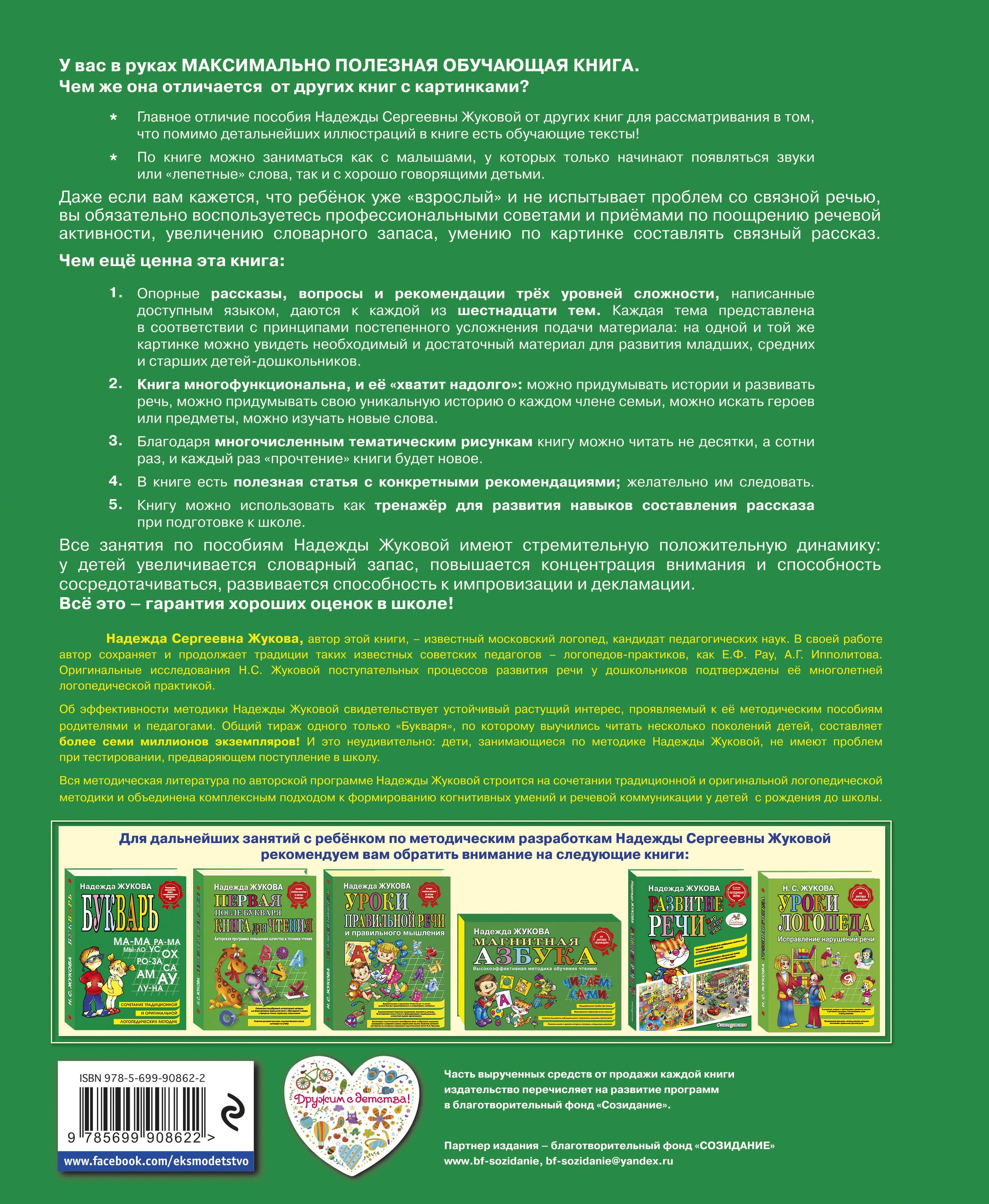 Пособие Надежды Жуковой - это МАКСИМАЛЬНО ПОЛЕЗНАЯ ОБУЧАЮЩАЯ КНИГА. Главное отличие пособия Надежды Жуковой от других книг для рассматривания в том, что помимо детальнейших иллюстраций в книге есть обучающие тексты! По книге можно заниматься как с малышами, у которых только начинают появляться звуки или "лепетные" слова, так и с хорошо говорящими детьми. Даже если вам кажется, что ребенок уже "взрослый" и не испытывает проблем со связной речью, вы обязательно воспользуетесь профессиональными советами и приемами по поощрению речевой активности, увеличению словарного запаса, умению по картинке составлять связный рассказ.| Издательство | ООО "Издательство "Эксмо" |