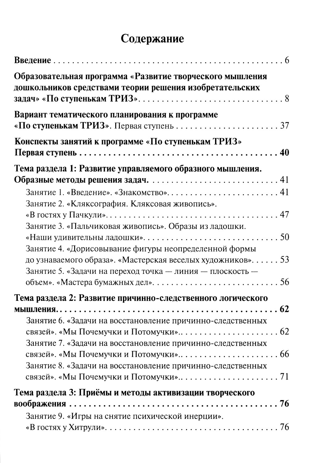 Первая ступень методического пособия «По ступенькам ТРИЗ» содержит программу, тематическое планирование и разработки занятий с детьми по развитию творческого мышления средствами ТРИЗ (теории решения изобретательских задач). Пособие предназначено для воспитателей дошкольных учреждений, преподавателей начальных классов, педагогов системы дополнительного образования и заинтересованных родителей. Занятия, представленные в пособии, уже показали свою эффективность в образовательных учреждениях Санкт-Петербурга, Москвы, Перми, Самары, Саратова, Мурманска, Челябинска, Екатеринбурга, Новосибирска и других городах России. Пособие сопровождается рабочей тетрадью для ребёнка «По ступенькам ТРИЗ». Желательно, чтобы преподаватель перед началом работы с детьми с использованием данного пособия получил определённые знания по ТРИЗ-педагогике. Весь комплекс содержит, помимо первой ступени, материалы нулевой, второй и третьей ступеней обучения.| Издательство | Солон-пресс |