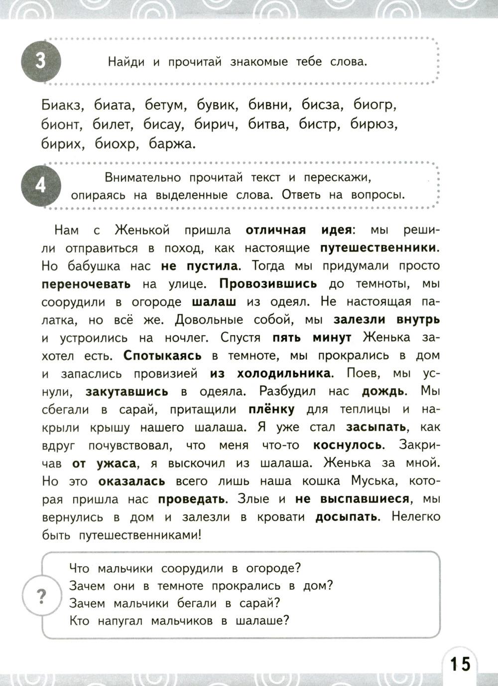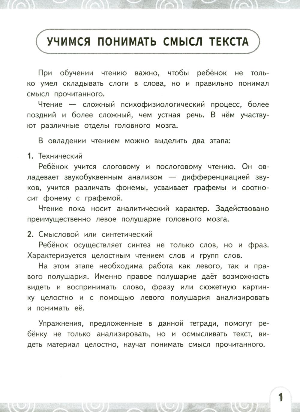 Ребёнок плохо понимает текст, с трудом пересказывает? Да, многим детям осмысленное чтение даётся с трудом. Специальная нейропсихологическая тетрадь для чтения поможет ребёнку преодолеть эти трудности. В этой тетради несколько видов заданий: рассказ по картинкам, поиск слов, пересказ текста и вопросы к нему. Задания в тетради усложняются постепенно, они воспринимаются как игра, и дети выполняют их с удовольствием. Ребёнку понятно, что нужно делать в каждом задании, поэтому он может заниматься самостоятельно, даже если плохо читает. Тетрадь рассчитана на 23 урока (по 4 задания в каждом). Занятия рекомендуется проводить 2-3 раза в неделю. Все задания составлены нейропсихологом. Ребёнок сможет не просто складывать слоги в слова, но научится осмысленному чтению.| Издательство | Айрис-Пресс |
