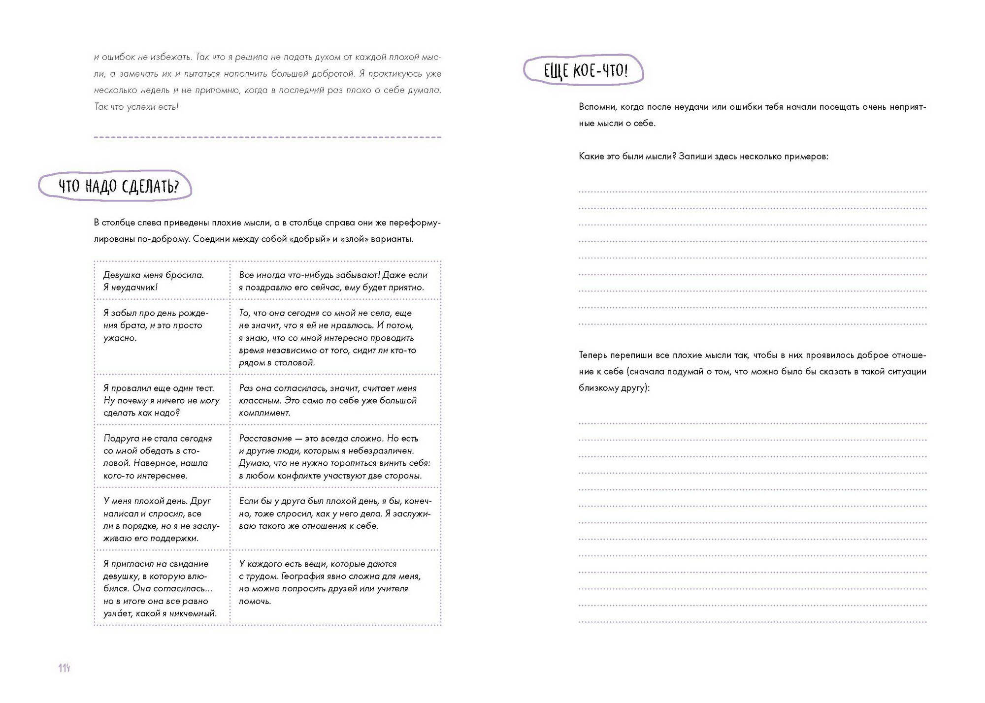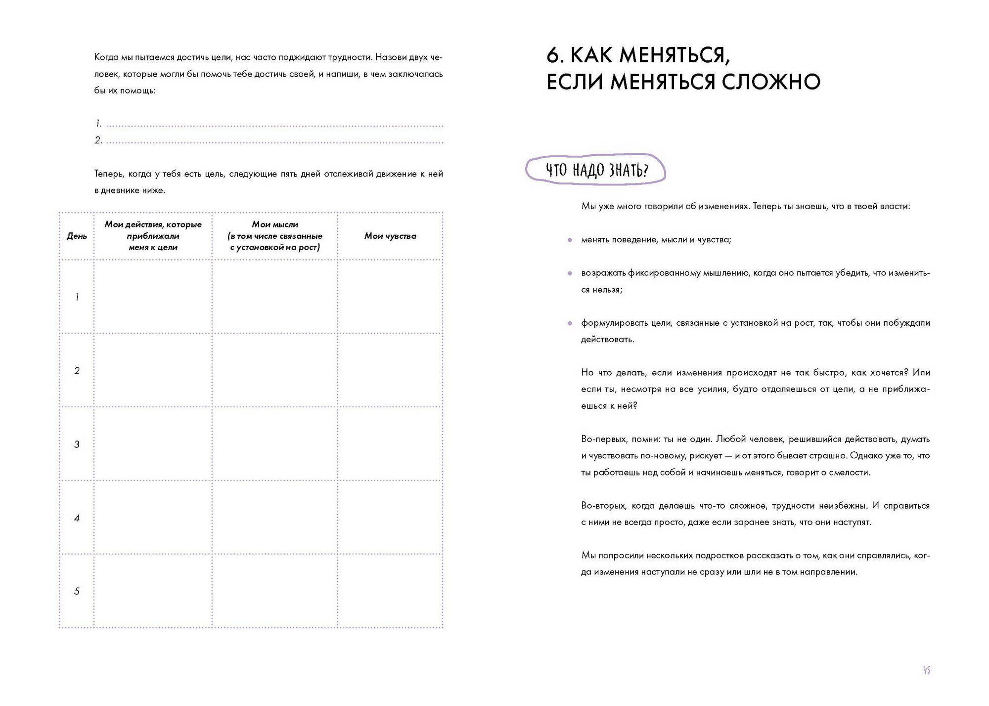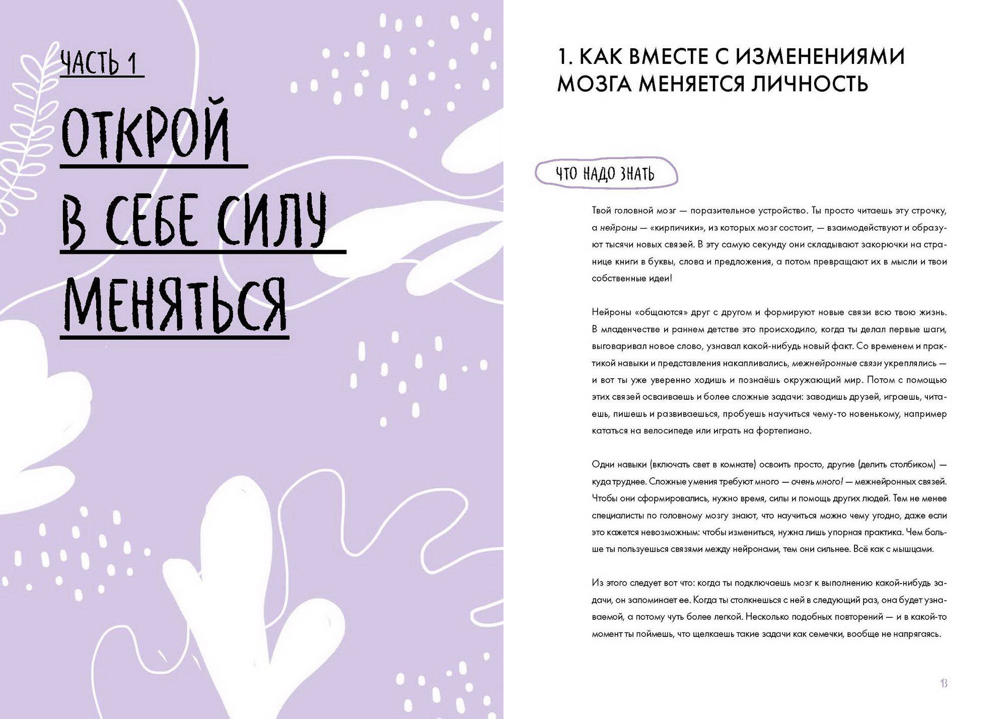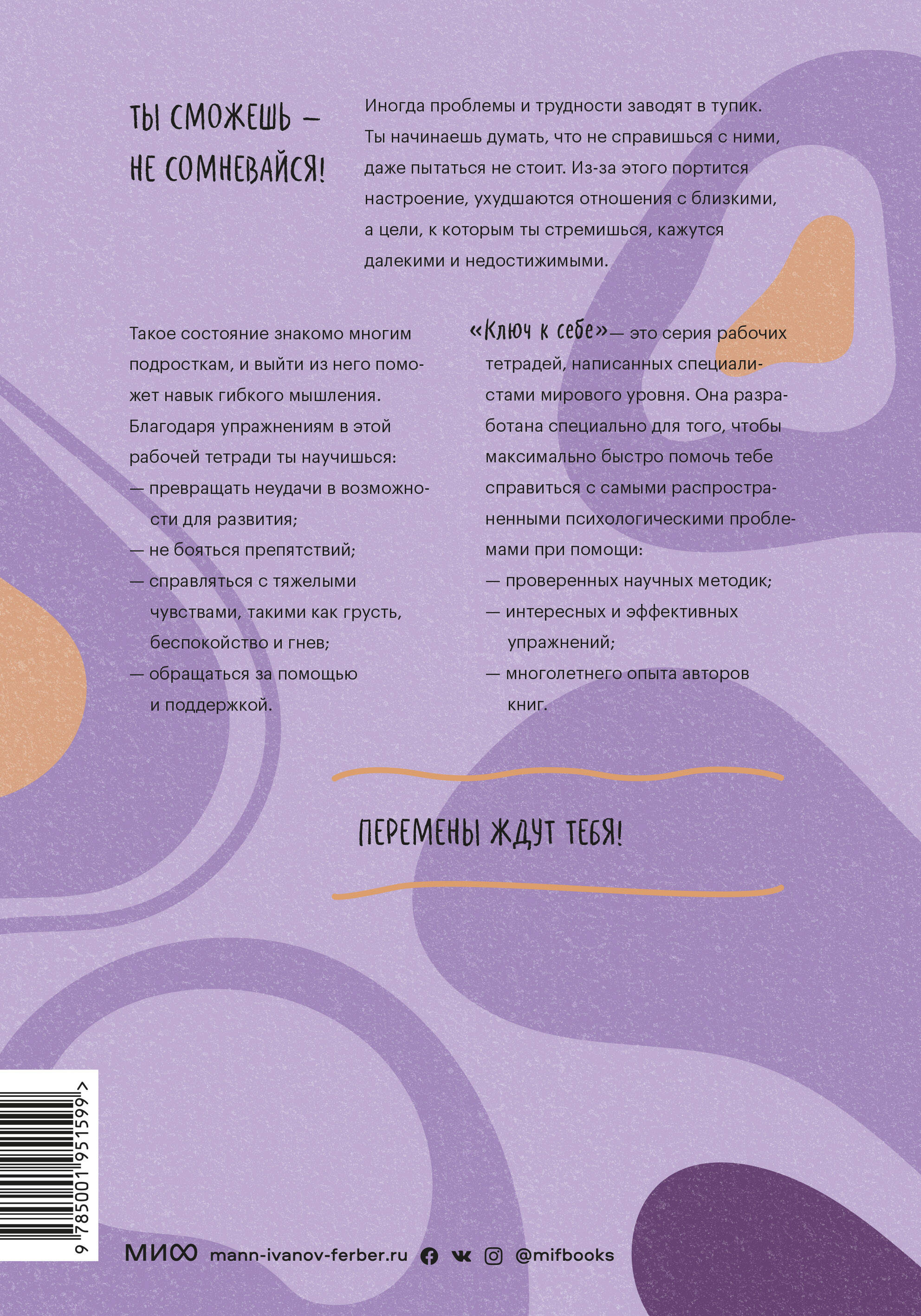 Практическое руководство от экспертов в области психологии и нейробиологии. Поможет подросткам изменить образ мышления, а вслед за ним - свою жизнь. Вы когда-нибудь сдаетесь, когда возникают трудности? Иногда мы все говорим что-то вроде: "Я плохо разбираюсь в математике, поэтому нет смысла учиться" или "Я не могу измениться - так зачем пытаться?" Это проявление установки на данность. Люди с установкой на данность уверены, что неудача - это доказательство их неспособности сделать что-то, и пробовать больше не стоит. Но есть и другой образ мышления - установка на рост: "Возможно, сейчас я не умею это делать, но если приложу усилия, то обязательно научусь и все получится". Люди с установкой на рост считают, что проблемы и неудачи помогают развиваться, что у них есть потенциал для роста, изменений и совершенствования. Как перейти от "Нет, я никогда не смогу" к "Давай попробуем"? Эта рабочая тетрадь поможет преобразовать установку на данность в установку на рост. Читатель научится справиться с трудными чувствами - печалью, беспокойством, гневом. Осознает свои цели и ценности. Станет увереннее в себе, чтобы достичь самых серьезных целей. От авторов Эта книга не о том, что все наладится само собой. Она о том, как и почему ты сам можешь постепенно наладить свою жизнь. Есть один секрет, который не знает большинство подростков, да и взрослые тоже: любой способен менять свои эмоции, мысли и даже то, какой он человек. Откуда это известно? Дело в том, что способность меняться - научно доказанный факт. Человеческий мозг - это сверхмощная машина перемен, а мозг подростков - твой в том числе - еще и один из самых гибких в этом отношении. Ты буквально рожден меняться. Другой важный секрет заключается в том, что понимание своей способности изменить черты и умения - его еще называют установкой на развитие - может привести к тому, что ты начнешь думать, чувствовать себя и действовать более рационально и тем самым преодолеешь неприятности и стресс и станешь тем "собой", которым ты по-настоящему хочешь быть. А еще установку на рост можно в себе выработать. Это навык, который развивается со временем - такой же как умение ездить на велосипеде и играть на фортепиано. Чем больше ты мысленно тренируешь такой настрой, тем проще тебе возразить всем этим "Я никогда. . . " и "Я не могу. . . ". Эти фразы почти всегда совершенно несправедливы и при этом заставляют отвратительно себя чувствовать. Но с помощью установки на рост ты сможешь превратить их в "А может быть, и получится" и перепрограммировать свой мозг так, чтобы чувствовать себя хорошо каждый день. Для кого эта книга Для подростков, которые часто сдаются, не верят в себя, и хотят осознать свой потенциал для роста, изменений и совершенствования. Для родителей, которые хотят укрепить эмоциональный интеллект и осознанность своих детей, помочь им в трудный подростковый период. О серии "Ключ к себе. Простые практики...