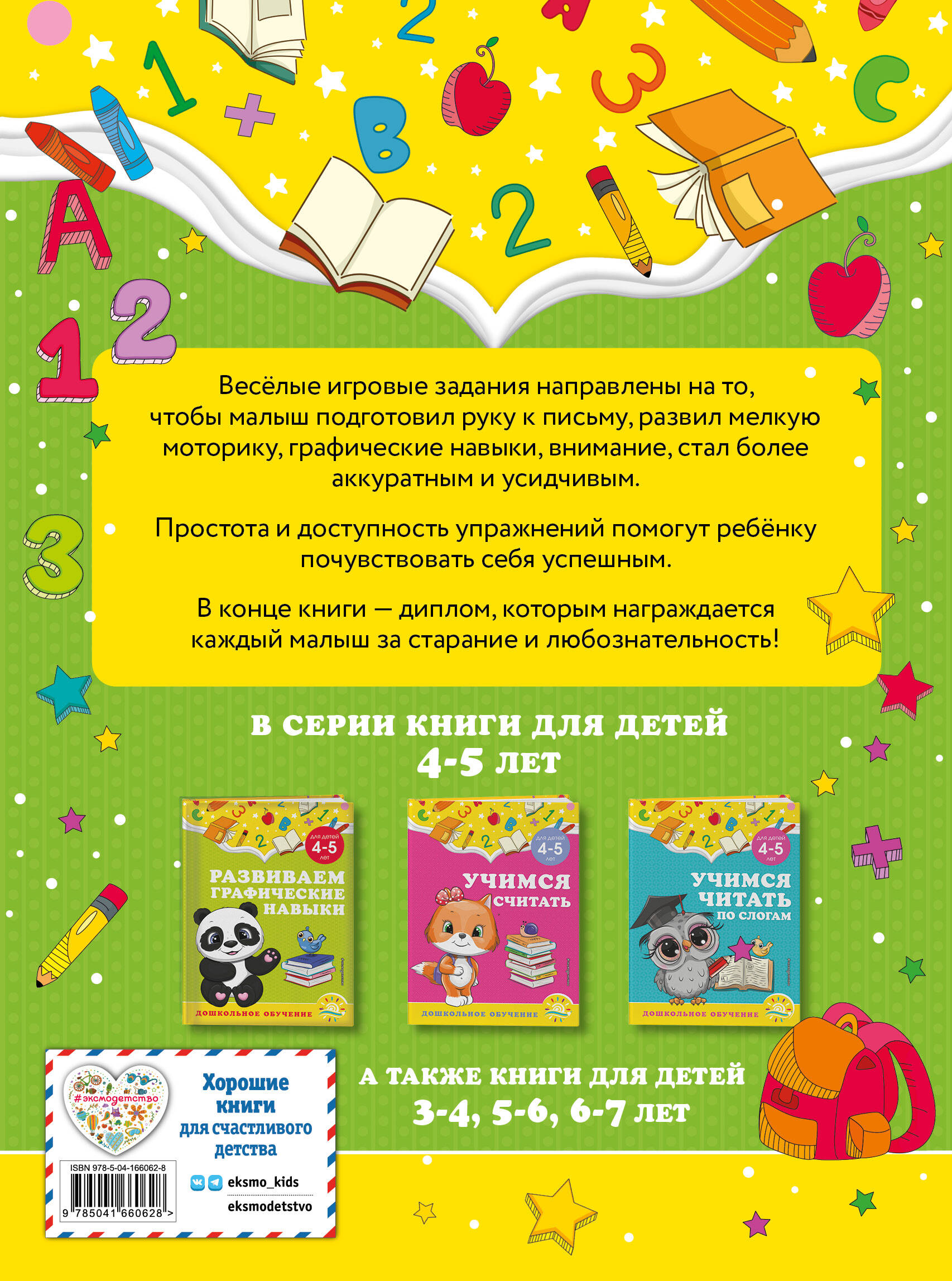 Благодаря этой книге малыш сможет развить графические навыки, а также потренировать внимание, логику и воображение. Все задания соответствуют ФГОС и направлены на то, чтобы ребёнок научился рисовать прямые, ломаные, волнистые линии, завитки и спирали, круги и овалы в процессе весёлой игры, а также с удовольствием рисовал по клеткам, штриховал картинки, дорисовывал симметричные изображения, проходил запутанные лабиринты и таким образом смог подготовить руку к письму. Добрые красочные рисунки помогут увлечь ребёнка интересным и полезным делом. В конце книги имеется диплом, которым награждается каждый малыш за старание и любознательность. Это будет мотивировать ребёнка к дальнейшему обучению.| Издательство | Эксмо |