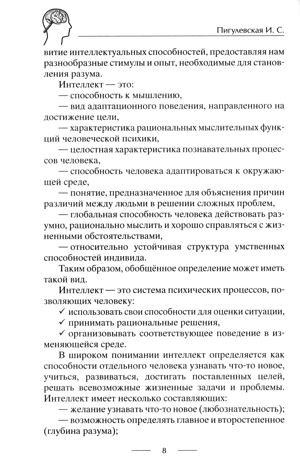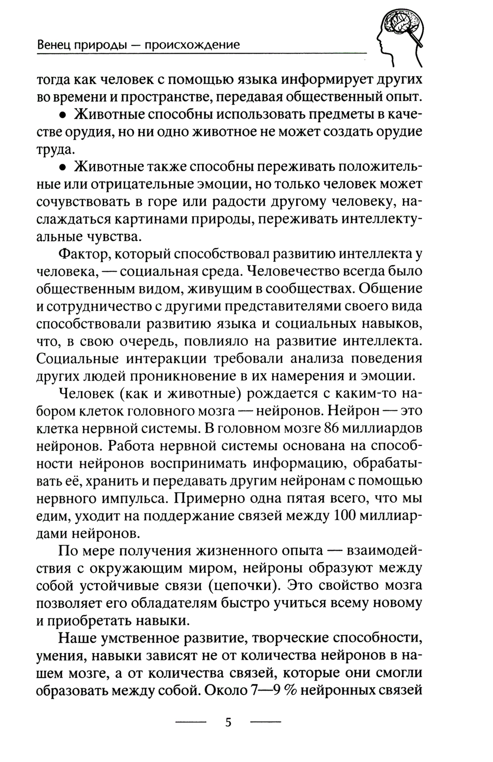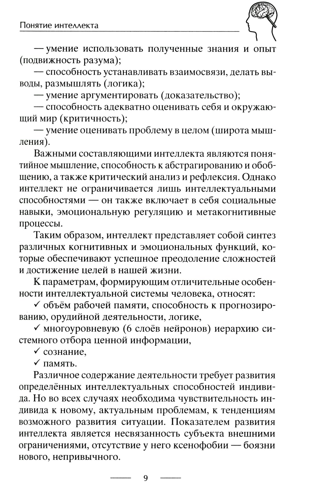 Интеллект - это уникальное свойство сознания, которое позволяет адаптироваться к окружающему миру, преодолевать сложные проблемы и достигать жизненных целей. Активизация умственной деятельности необходима сегодня всё большему числу людей - прогресс не стоит на месте, и для многих учебных или рабочих процессов требуется высокий уровень интеллекта, ключевую роль в развитии которого играют непрерывное обучение и саморазвитие. Участие в онлайн-курсах, мастер-классах и образовательных семинарах позволяет осваивать новые знания и обновлять старые - развивать нейронные связи. Интеллектуальное развитие - величина непостоянная. Умственные способности можно и нужно развивать, причём в любом возрасте. Известно много случаев, когда даже глубокие старики сохраняли «здравый рассудок», потому что постоянно тренировали свой мозг. Хотите сохранить на долгие годы высокий интеллект, ясный ум и твёрдую память? Читайте книгу, и вы получите массу полезной информации, загадок и упражнений для развития внимания, памяти и логики.| Издательство | Центрполиграф |