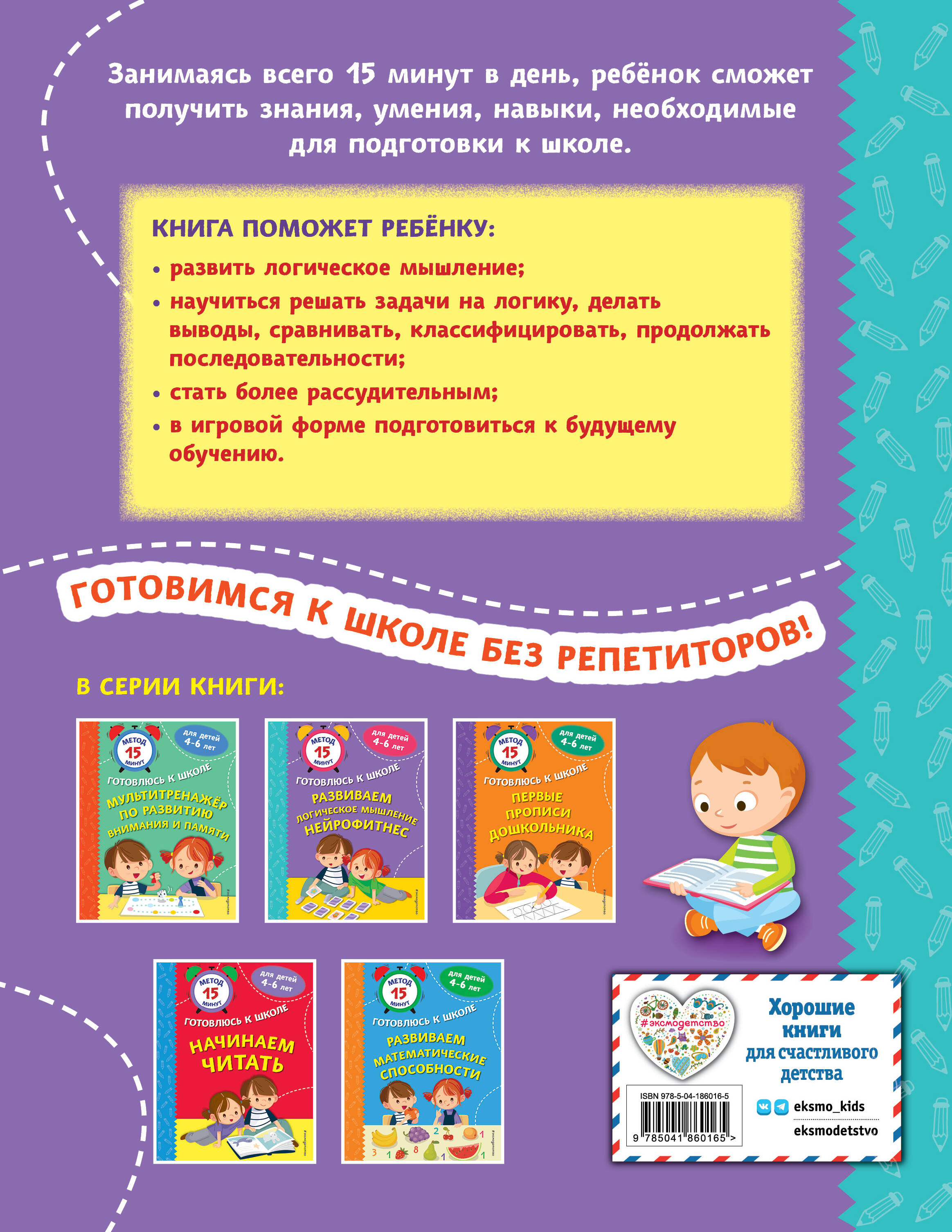 Обучающая книга для детей направлена на то, чтобы максимально развить логическое мышление ребёнка и подготовить маленького непоседу к школе не столько через усвоение базовых знаний, сколько через развитие основных психических функций и познавательных способностей. Игровая авторская методика, апробированная на практике, гарантирует высокий результат. Для удобства материал разделён на небольшие занятия, которых будет достаточно, чтобы прокачать мозговые функции. Каждый разворот книги - отдельное занятие, рассчитанное на 15 минут и состоящее из занимательных заданий, направленных на развитие логики. Ребёнку предлагается ответить на вопросы, найти лишний предмет, дорисовать нужную фигуру, найти предмет по описанию, разделить множество на группы по определённому признаку. В результате дети научатся описывать предмет, называя его признаки; сравнивать, находя сходства и различия; делить предметы на группы; делить предмет на части и соединять части в целое; решать логические задачи; определять закономерность и продолжать последовательность; работать со схемами. Задания написаны в занимательной форме, чтобы за несколько минут игры дошкольник незаметно для самого себя поднялся на новую ступеньку в развитии логического мышления. Выполнять упражнения можно под музыкальные произведения, которые помогут настроиться на определенный темп работы, что способствует снятию эмоционального напряжения. Книга Издательства «Эксмо» станет полезным подарком каждому мальчику или девочке при подготовке к школе.| Издательство | ООО "Издательство "Эксмо" |