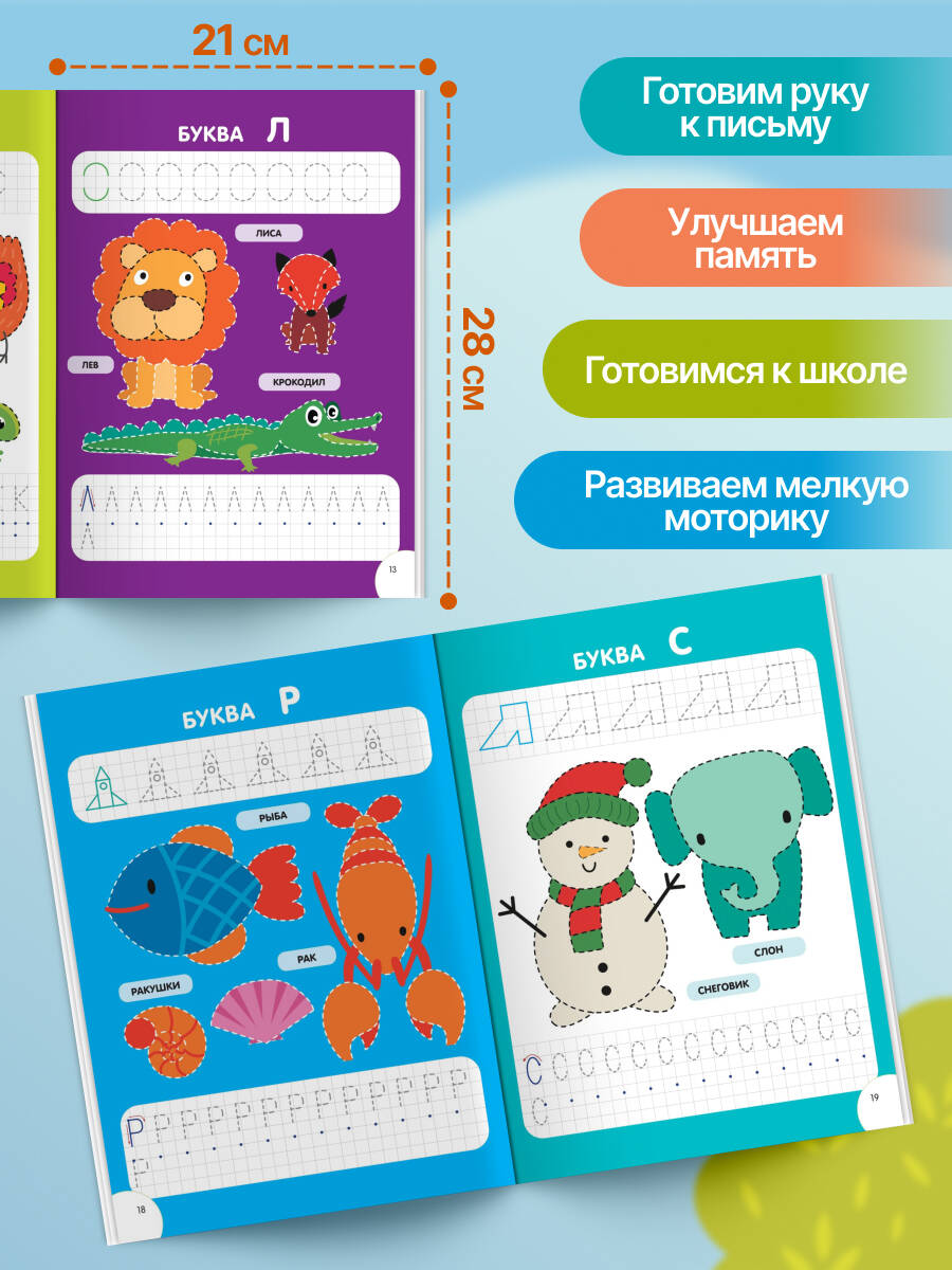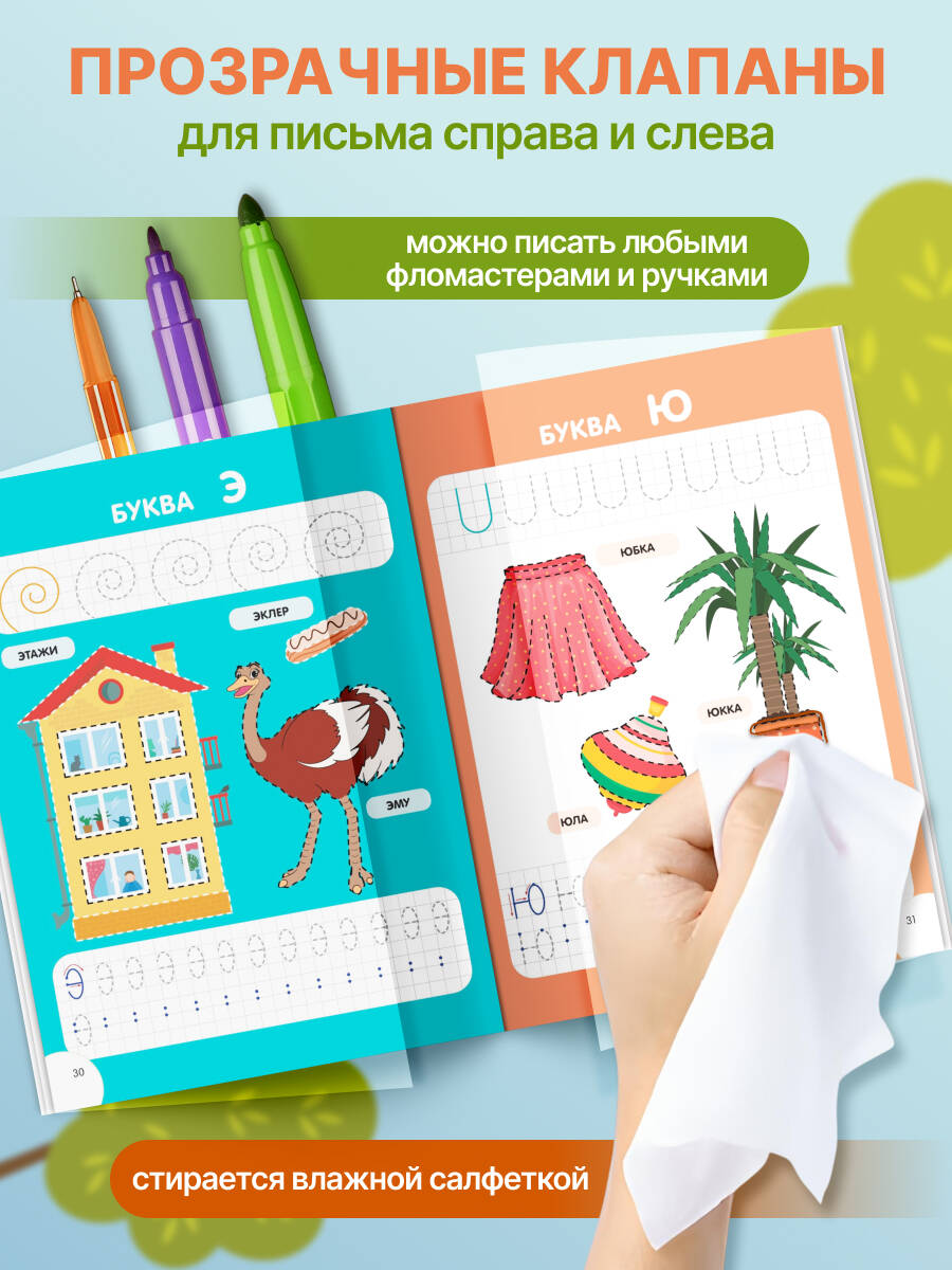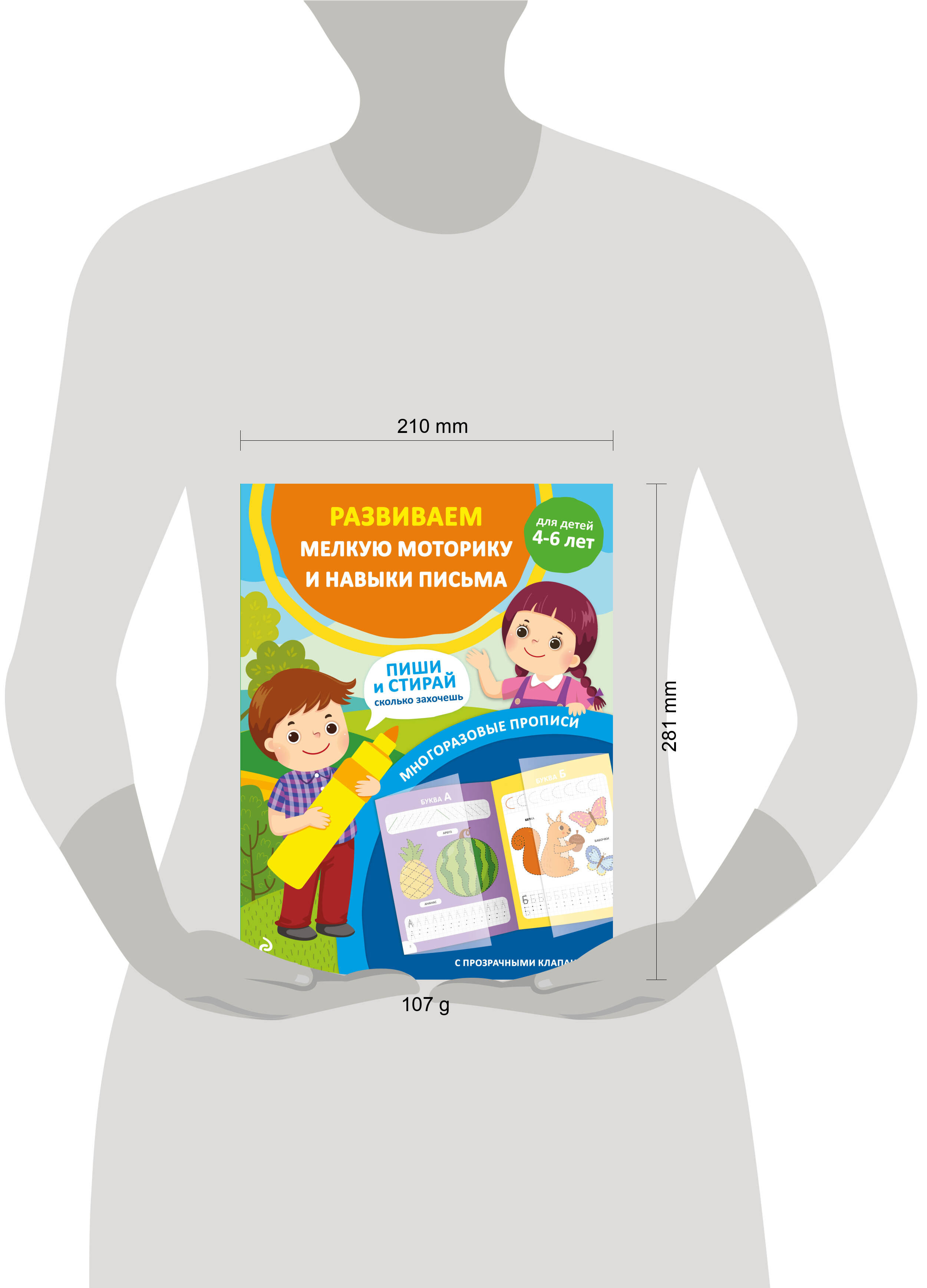 Эти необычные многоразовые прописи помогут детям 4-6 лет развить мелкую моторику и научиться писать печатные буквы. Бумажные страницы справа и слева накрываются прозрачными клапанами из специального материала - по нему можно многократно писать любым фломастером или маркером, а потом стирать написанное влажной салфеткой. Пользоваться такими прописями можно бесконечно долго, совершенствуя правильность выполнения графических заданий и точность написания букв. Развитие мелкой моторики способствует совершенствованию когнитивных функций мозга: памяти, внимания, логического мышления, которые помогут ребёнку эффективнее учиться. Лучше, если ребёнок начнёт знакомиться с пособием в присутствии взрослого, который может задать наводящие вопросы или попросить выполнить какое-то задание несколько раз. В дальнейшем дошкольник может с удовольствием выполнять знакомые упражнения самостоятельно. Ребёнок будет писать в прописях много-много раз, не задумываясь: «А вдруг не получится?» Книга Издательства «ЭКСМО» станет для малыша любимым тренажёром, который поможет ему успешно подготовиться к поступлению в первый класс.