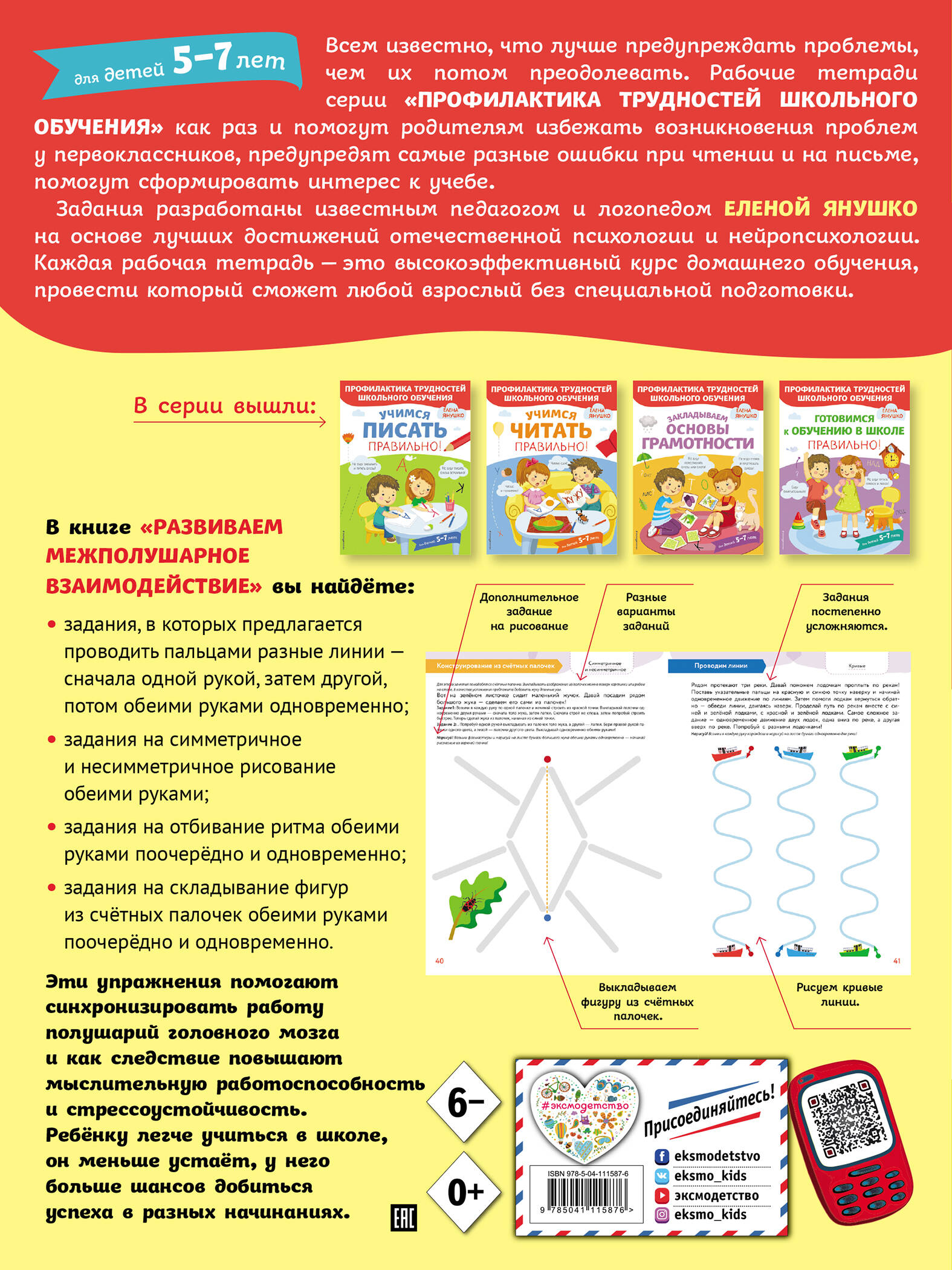 Только взаимосвязанная работа двух полушарий мозга обеспечивает нормальную работу всех психических процессов. В книге «Развиваем межполушарное взаимодействие» известный педагог-психолог Елена Янушко предлагает специальные упражнения, которые помогают синхронизировать работу полушарий головного мозга ребёнка. В свою очередь развитое межполушарное взаимодействие повышает мыслительную работоспособность и стрессоустойчивость, и, как следствие, ребёнку легче учиться в школе, он меньше устаёт, у него больше шансов добиться успеха в разных начинаниях.| Издательство | ООО "Издательство "Эксмо" |