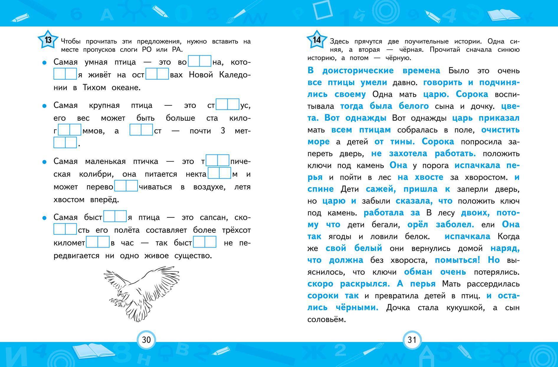Цель книги - сделать из ученика настоящего читателя, который бегло читает, понимает прочитанное и постоянно совершенствует навык чтения. Развивающее пособие от издательства «Эксмо» поможет младшему школьнику довести навык беглого чтения до автоматизма, повысить уровень внимания, расширить словарный запас, узнать много интересной и полезной информации о флоре и фауне. В основе книги Емельяновой Е. Н., практикующего педагога-нейропсихолога «Центра детской нейропсихологии им. А. Р. Лурия», признанного специалиста в этой области, автора многих популярных развивающих пособий, лежит нейропсихологический подход, способствующий быстрому и эффективному обучению чтению. Развивающие задания составлены таким образом, чтобы каждое упражнение продвинуло маленького читателя на шаг вперёд. Книга разделена на 6 больших тематических глав: «Фрукты, овощи и ягоды», «Цветы», «Птицы», «Насекомые», «Дикие звери», «Рыбы», по 14 разноплановых заданий на отработку навыков беглого чтения в каждой. В конце глав имеются ответы для самопроверки. Автоматизация навыка чтения будут неоценимым вкладом в образование ребёнка и позволит ему реализовать заложенные в нём таланты.| Издательство | ООО "Издательство "Эксмо" |
