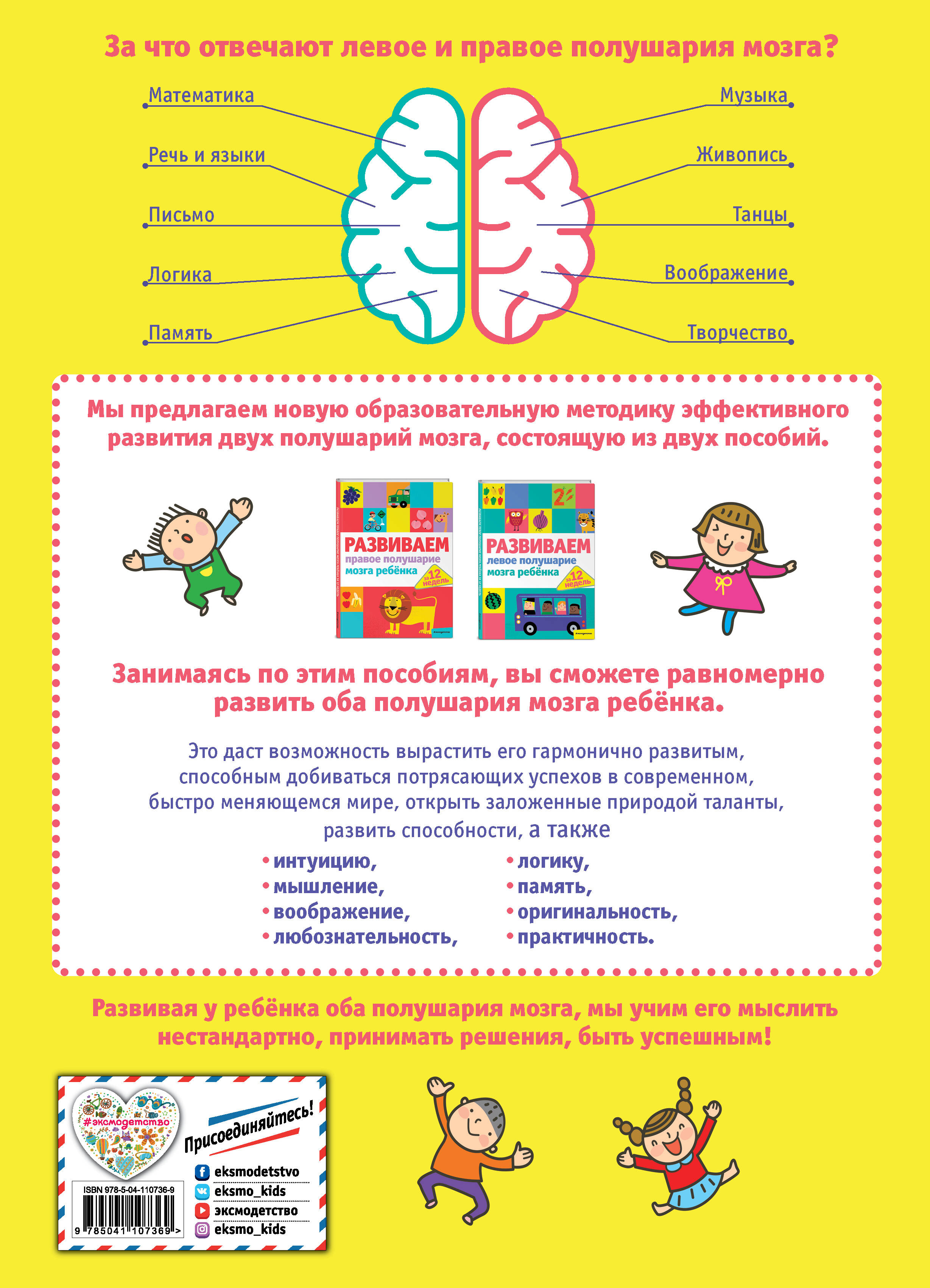 Правое и левое полушария мозга обеспечивают единую работу организма, но при этом каждое полушарие выполняет определённые задачи и отвечает за конкретные функции. Работа их взаимосвязана. Для формирования гармонично развитой личности необходимо уделять одинаковое внимание развитию двух полушарий мозга. Именно это является целью предлагаемой методики. Задача этого пособия - оказать родителям квалифицированную помощь в развитии правого полушария. Увлекательные игровые задания, рассчитанные на 12 недель занятий, помогут ребенку научиться правильно обрабатывать и воспринимать невербальную информацию, развить музыкальные, художественные, литературные способности, воображение и интуицию. В сочетании с пособием по развитию левого полушария мозга - развитие ребенка будет гармоничным. Адресовано любознательным дошкольникам и их заботливым родителям и может использоваться, как для индивидуальных занятий, так и в группах.| Издательство | ООО "Издательство "Эксмо" |