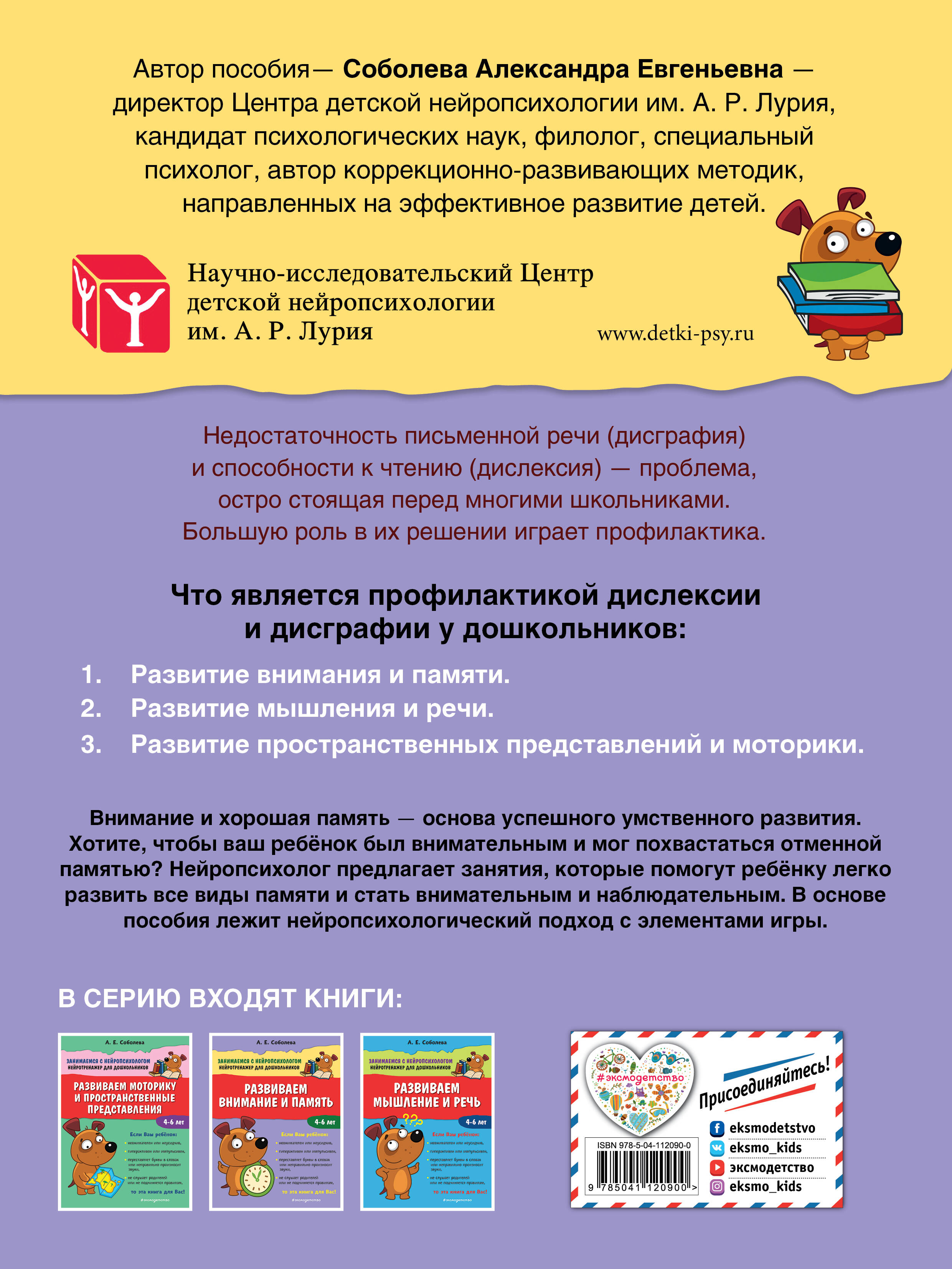 Пособие, соответствующее ФГОС, способствует формированию у ребёнка необходимых для будущего обучения высших психических функций - внимания и памяти, а также станет современной профилактикой дисграфии и дислексии у дошкольников. В книге использован нейропсихологический подход с элементами игры, как ведущего вида деятельности дошкольника. Выполняя увлекательные интерактивные задания, ребенок научится концентрировать внимание на конкретном задании, разовьёт память, будет более аккуратным и усидчивым. Педагогические подсказки для родителей изложены в каждом задании в блоке «Родителям». Приобретая эту серию книг, вы сможете: 1. сформировать у ребенка умение концентрировать и распределять зрительное и слухоречевое внимание; 2. развить его зрительную и моторную память; 3. получить квалифицированные советы специалиста; 4. научить ребенка сосредотачиваться на главном и быстро переключаться с одной задачи на другую; 5. помочь дошкольнику стать более усидчивым и аккуратным.| Издательство | ООО "Издательство "Эксмо" |