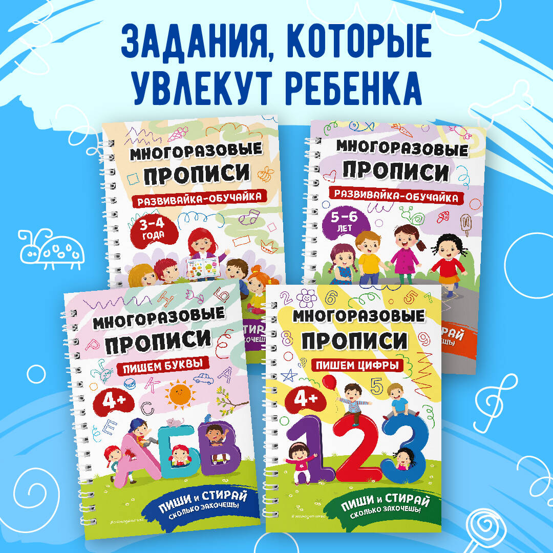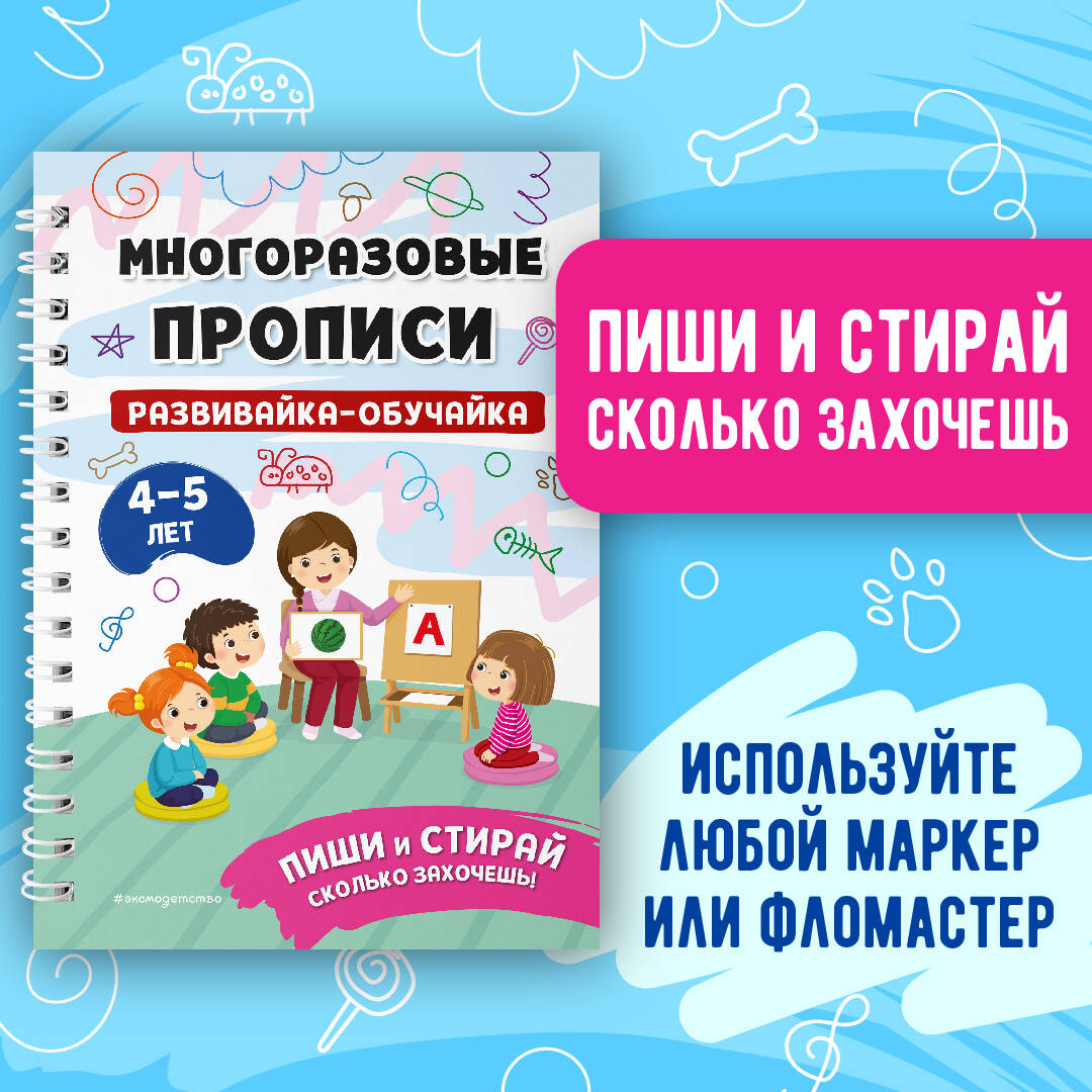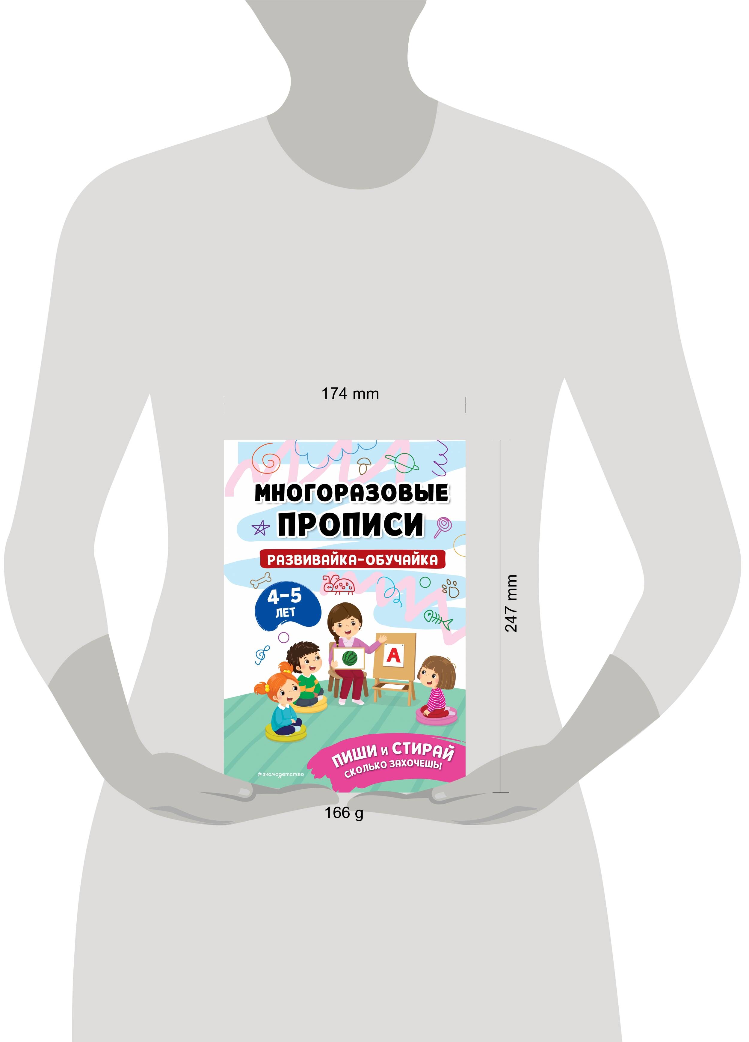 Многоразовые прописи для детей 4-5 лет - уникальное пособие, которого хватит надолго! Дошкольник сможет писать и рисовать в тетради маркером или фломастером сколько угодно раз, а потом сам стирать написанное салфеткой. Выполняя увлекательные игровые задания, он не только разовьет мелкую моторику, но и научится считать до десяти, писать цифры, печатные буквы русского алфавита и короткие слова, запомнит геометрические фигуры, разовьет внимание и логическое мышление. Размер пособия - немного больше ученической тетради и, по мнению психологов, идеален для детских занятий. Прописи не боятся воды и устойчивы к механическим воздействиям. Их удобно брать с собой в дорогу. Пособие станет любимой игрушкой вашего ребенка, он не захочет выпускать его из рук.