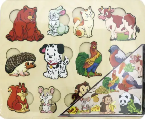 Двухслойная рамка с вкладышами: под верхними вкладышами прячутся внутренние, которые тоже можно вынуть. Верхние вкладыши это животные. А внутренние - их пища.