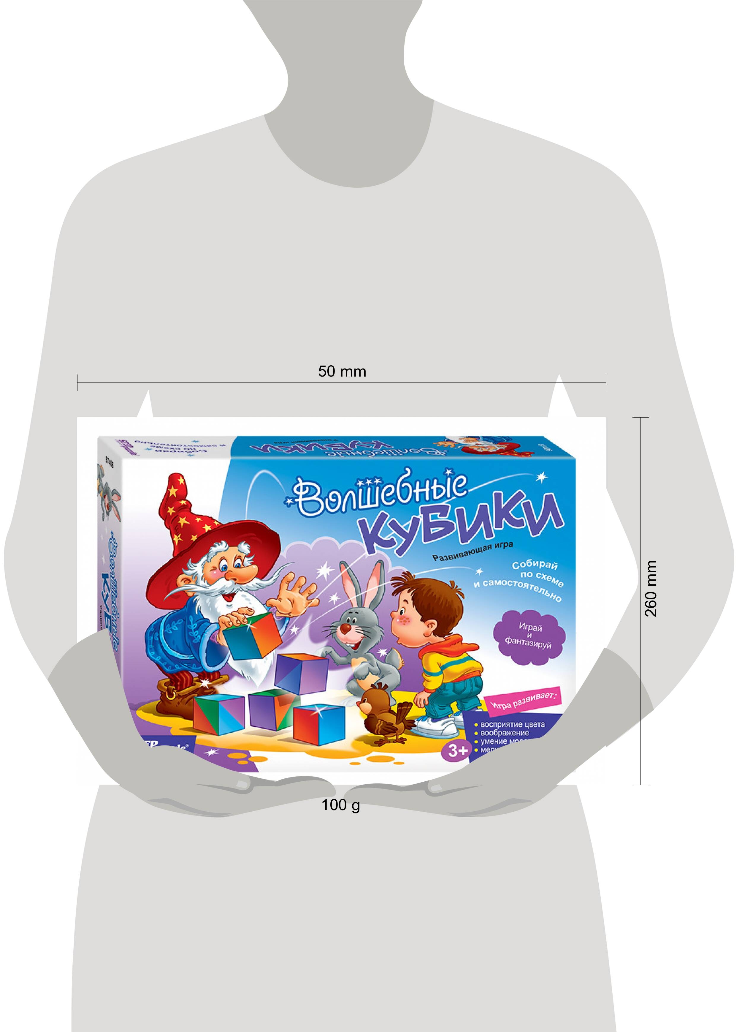 Настольная игра "Волшебные кубики" способствует развитию у ребенка навыков логического мышления. Также игра развивает восприятие цвета, воображение, умение моделировать. Игра поможет ребенку научиться составлять различные геометрические узоры. Действуя от простого к сложному, ребенок освоит первый этап игры. Второй этап - тренировка воображения и создание собственных узоров. Состав игры: - кубики - 9 шт.; - правила игры. Правила игры подробно описаны в инструкции. Суть игры: создание узоров с помощью кубиков. Задания составлены по возрастанию сложности. Возраст игроков: игра будет интересна детям от 3 лет. Время игры: 10-15 минут. Материал: пластмасса. Инструкция к игре (PDF)| Издательство | Степ Пазл ЗАО |