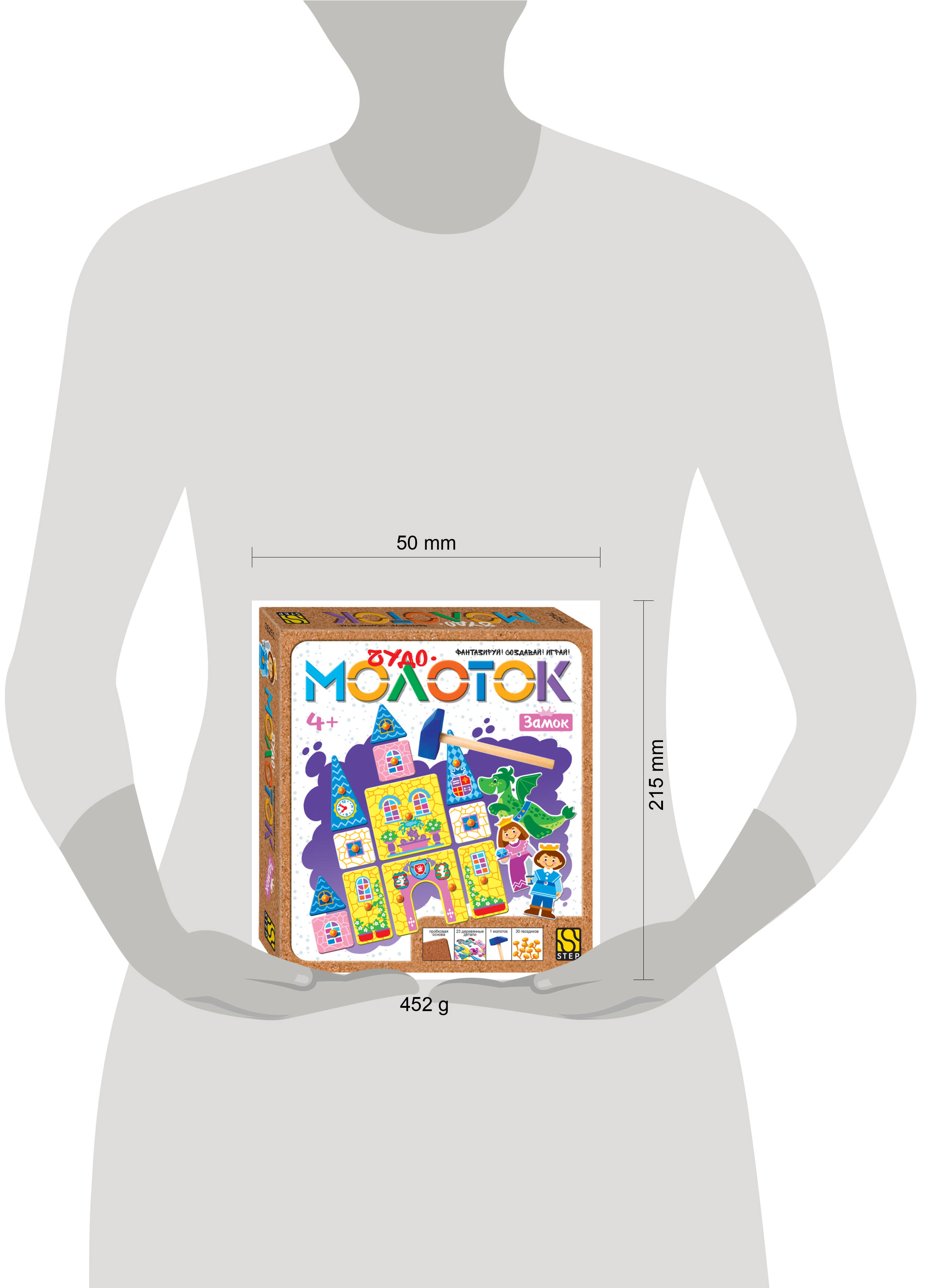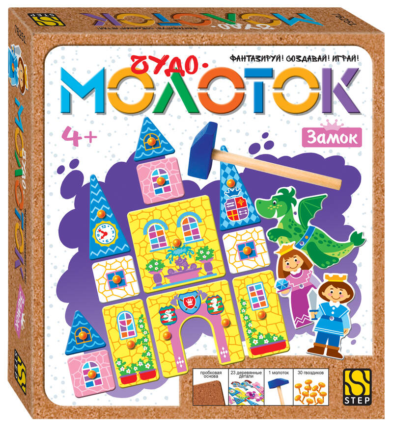 Развивающая игра "Замок. Чудо-молоток" - настольная игра для создания картин из дерева. Задача игры - собирать картинки из деревянных деталей и прибивать молоточком к пробковой основе. Что полезного в игре? "Замок. Чудо-молоток" развивает творческие, сенсомоторные и конструктивные навыки ребенка. Оригинальные фигурки из дерева помогают в создании увлекательных игровых сюжетов. Ребенок учится логически мыслить, придумывать образы, но при этом попутно действует руками. Что входит в набор? 1 приятная на ощупь пробковая основа (20*23 см) - гвоздики легко крепятся и удаляются. 23 деревянные детали: принц, принцесса, лошадь, дракон, собака и элементы самого замка. В каждой детали сделана дырочка, чтобы вставлять гвоздик и прибивать ее к основе. 1 деревянный молоточек. Он безопасен для ребенка и не содержит металлических частей, но при этом легко вбивает гвозди в основу. Играя с таким молоточком, ребенок не причинит себе травму. 30 металлических гвоздиков с круглыми позолоченными шляпками. Как играть? Смысл прост - надо заранее придумать сюжет и расположить детали на основе. Затем эти детали при помощи гвоздиков следует прибить к основе. Возраст игроков: от 4 лет. Количество игроков: в игру "Замок. Чудо-молоток" удобнее играть поодиночке. Время игры: 10-15 минут. Материалы: дерево, металл, пробка. Порадуйте ребенка увлекательной развивающей игрой "Замок. Чудо-молоток". Этот подарок будет и интересным, и полезным.| Издательство | Степ Пазл ЗАО |