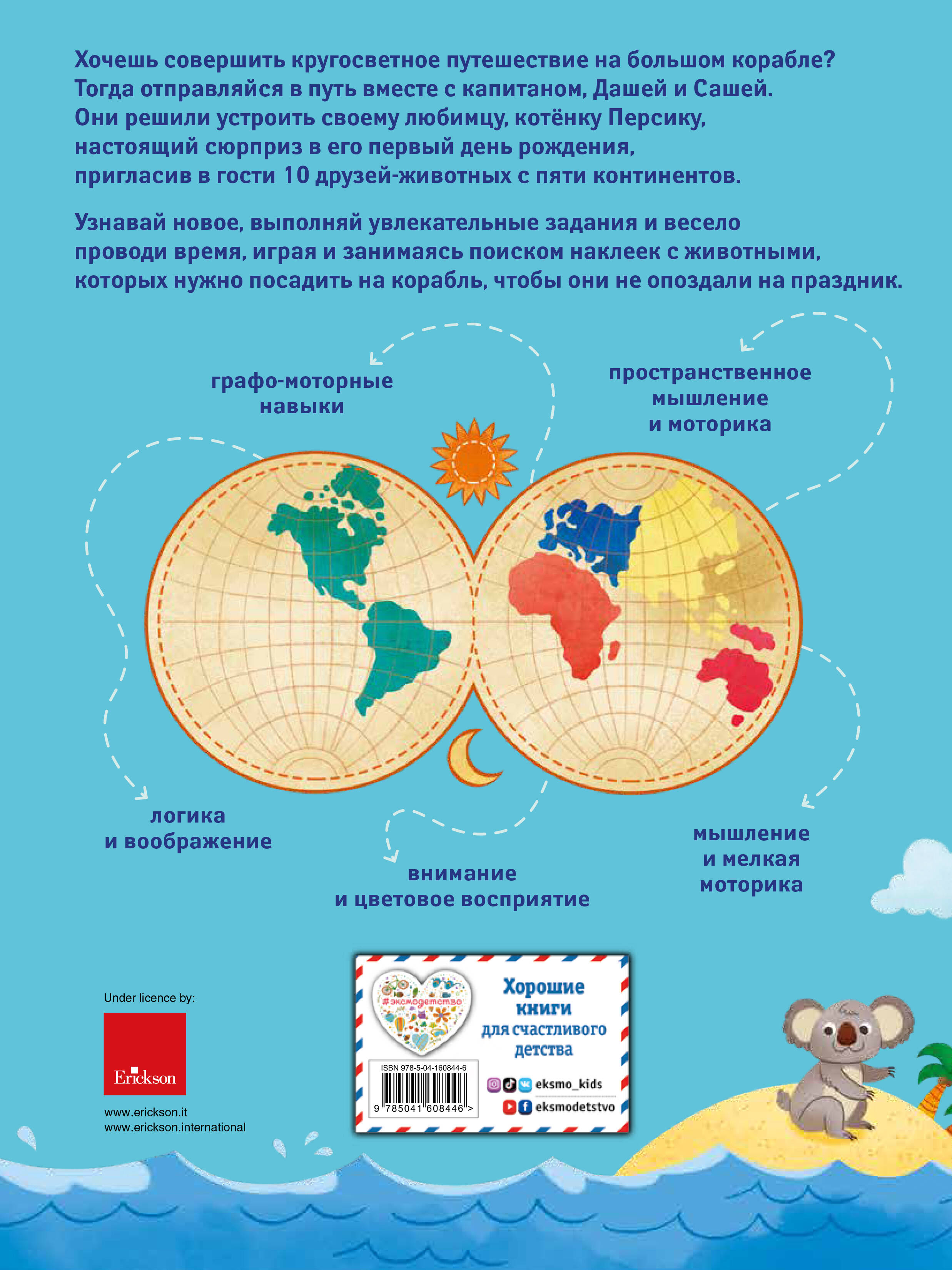 Красочное развивающее пособие поможет любознательному ребёнку побывать на разных континентах и собрать с помощью наклеек друзей котёнка Персика, чтобы в весёлой компании отпраздновать его день рождения. Во время этого круиза ребёнок будет выполнять игровые задания, развивая при этом графомоторные навыки, мышление, внимание, познавательные способности.