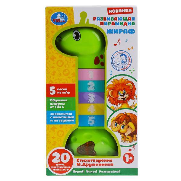 Милый образ жирафа сразу привлечёт внимание малыша. Игрушка воспроизводит 20 звуков, стихотворений и песен из мультфильмов. Игра с этой развивающей музыкальной пирамидкой способствует развитию фантазии, музыкального слуха и мелкой моторики ребенка. Рекомендована педиатром Комаровским. Обучающая музыкальная игрушка "Развивающая пирамидка. Жираф" ТМ "УМка" с функционалом 5 в 1: - Слушаем: звуковые эффекты; - Играем: крутим и вращаем, собираем и разбираем весёлую пирамидку; - Учимся: обучение цифрам от 1 до 5-ти; - Знакомимся с животными и звуками, которые они издают; - Музыкальная игрушка: воспроизводит 5 песен из любимых детских мультфильмов.| Издательство | СИМБАТ ООО |