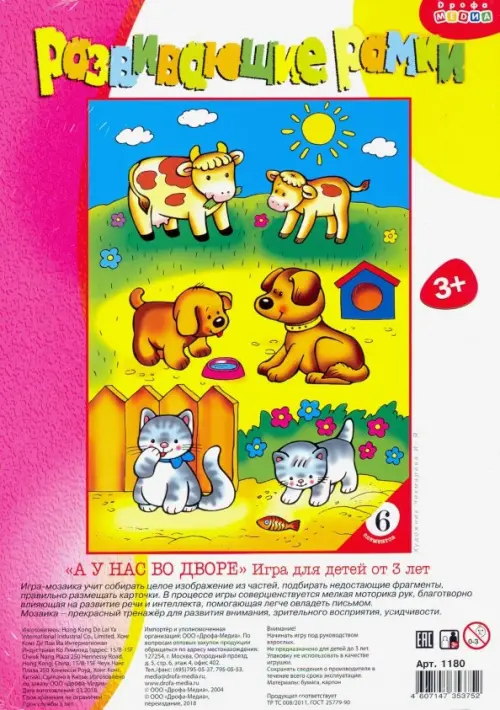Игры-мозаики познакомят ребенка с геометрическими фигурами, научат находить недостающие детали рисунка. Чтобы сложить из частей целое изображение, малыш должен проявить сообразительность и наблюдательность, терпение и настойчивость. Элемент самопроверки позволяет ребенку играть самостоятельно и при этом видеть, что он делает правильно, а над чем нужно подумать еще. Но главное, во время игры ребенок постоянно манипулирует деталями мозаики. Таким образом совершенствуется мелкая моторика рук. Известно, что развитие кистей и пальчиков ребенка напрямую влияет на развитие его речи и интеллектуальных способностей. В дальнейшем хорошая координация движений рук поможет маленькому ученику легко овладеть письмом. Игра: - знакомит с домашними животными, лесными и луговыми растениями, различными видами транспорта; - развивают мелкую моторику рук ребенка, учат находить детали, подходящие по форме и изображению; Возраст: 1-3 года Количество игроков: 1 Комплектация: рамка, элементы мозаики.
