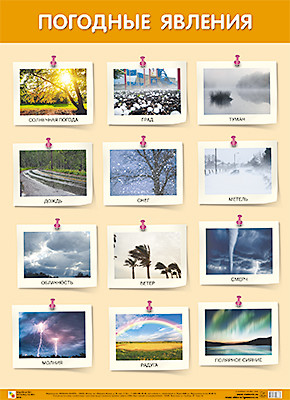 Красочный плакат познакомит детей с различными погодными и атмосферными явлениями: грозой, метелью, полярным сиянием и многим другим. Четкие, яркие фотографии обязательно заинтересуют малышей и помогут в усвоении новых знаний. Наглядный материал может быть использован на занятиях по ознакомлению с окружающим миром, для развития речи и мышления.