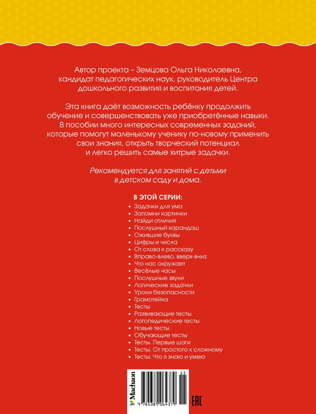 Автор проекта - Земцова Ольга Николаевна, кандидат педагогических наук, руководитель Центра дошкольного развития и воспитания детей. Эта книга даёт возможность ребёнку продолжить обучение и совершенствовать уже приобретённые навыки. В пособии много интересных современных заданий, которые помогут маленькому ученику по-новому применить свои знания, открыть творческий потенциал и легко решить самые хитрые задачки. Рекомендуется для занятий с детьми в детском саду и дома.| Издательство | Махаон |
