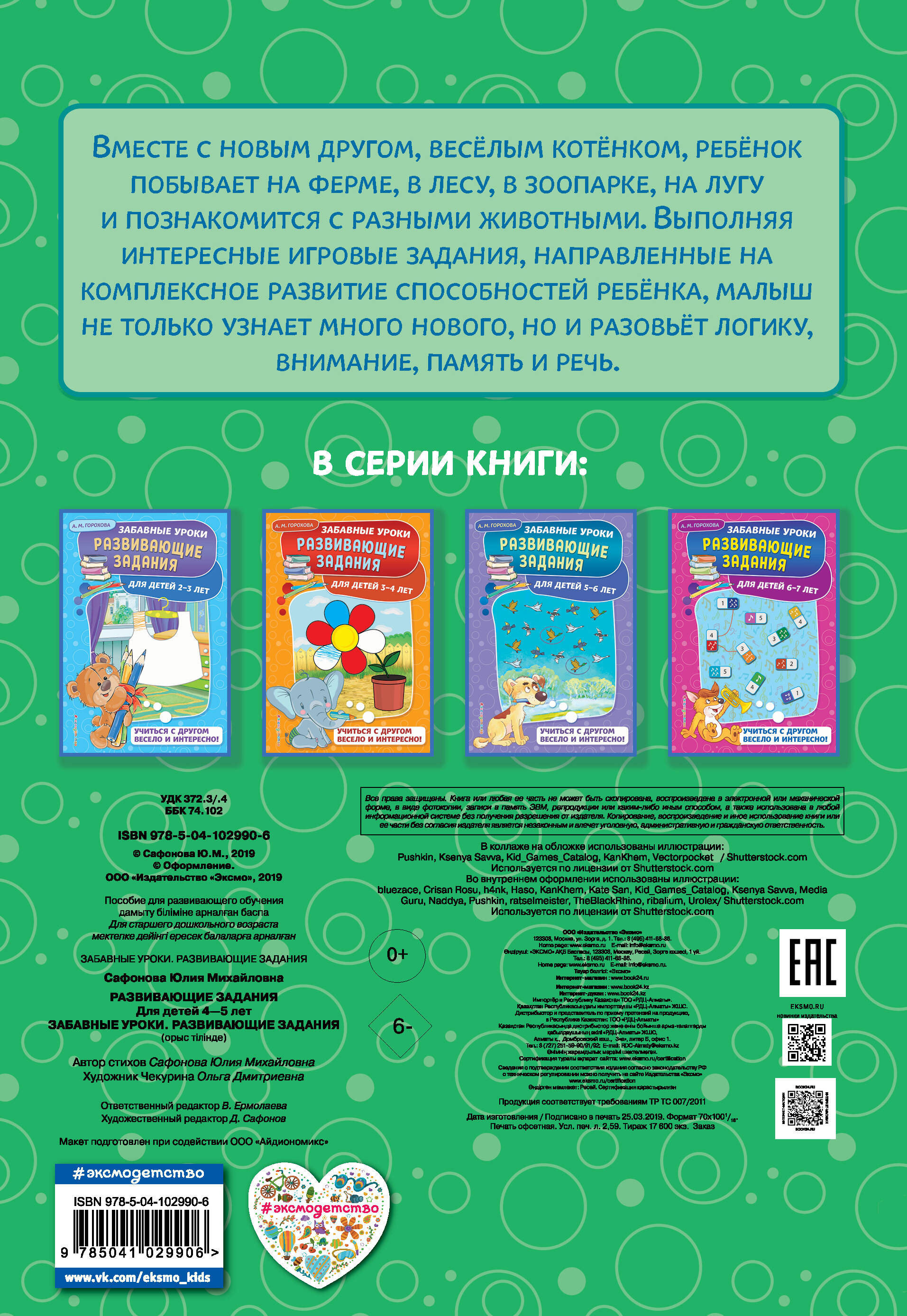 Цель книги - эмоциональное и интеллектуальное и развитие малыша 4-х лет. Главный герой, четырёхлетний котёнок, предлагает ребёнку выполнить вместе с ним игровые увлекательные задания. Занимаясь с четвероногим другом, малыш посетит ферму, отправится в лес и в зоопарк, побывает на лугу, узнает много нужного, полезного и интересного. Весёлые красочные рисунки привлекут внимание малыша и найдут эмоциональный отклик, а простота и доступность упражнений даст возможность ребёнку осознать, что он уже многое умеет. Работая с пособием, ребёнок, сможет развить основные когнитивные функции: мышление, память, внимание, речь моторику, расширить словарный запас и кругозор.| Издательство | ООО "Издательство "Эксмо" |