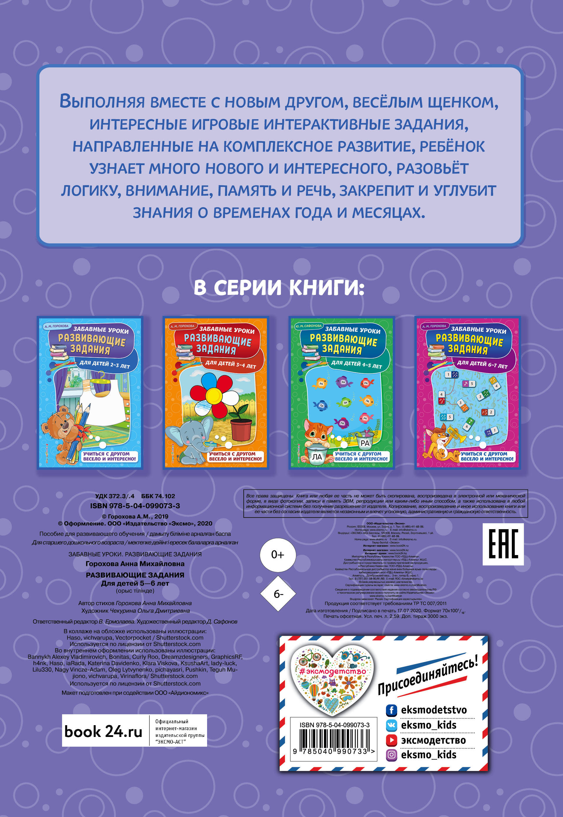 Цель книги - интеллектуальное и эмоциональное развитие пятилетнего ребёнка. Главный герой книги - забавный щенок. Это поможет установить доверительные отношения и будет способствовать активному усвоению новых знаний. Занимаясь вместе с новым другом, ребёнок потренирует основные когнитивные функции: мышление, внимание, моторику, память, речь, воображение, расширит словарный запас и кругозор, закрепит знания о временах года и месяцах. Весёлые красочные картинки привлекут внимание ребёнка и найдут эмоциональный отклик. Игровая форма подачи материала поможет ему активно участвовать в обучающем процессе, а простота и доступность упражнений даст возможность малышу осознать, что он уже многое умеет.| Издательство | ООО "Издательство "Эксмо" |