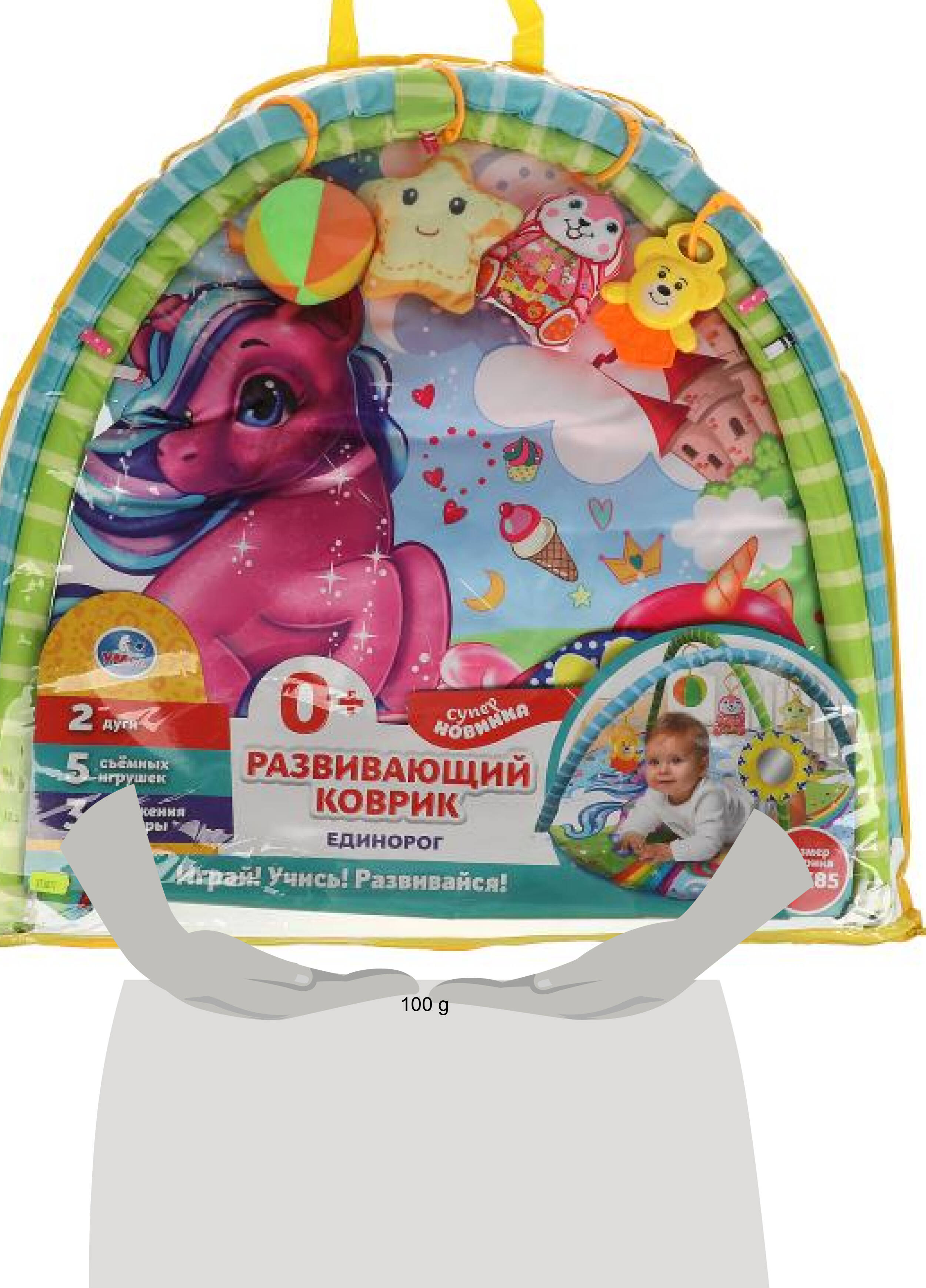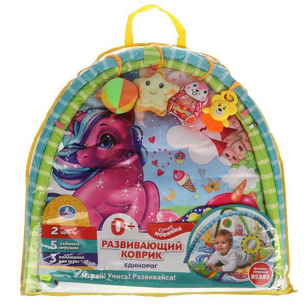 Детский развивающий коврик "Единорог" ТМ "УМка" - яркая и увлекательная игровая площадка для самых маленьких. Особенности и комплектация: - 5 мягких съемных игрушек - 2 дуги - 3 положения для игры Весёлые игрушки и яркие цвета позволят надолго увлечь малыша. Игрушки крепятся к дугам, которые устанавливаются сверху. Когда ребёнок подрастёт, дуги можно снять. Детский игровой коврик ТМ "УМка" способствует развитию: - мелкой моторики - слухового и визуального восприятия - цветовосприятия - координации движений Размеры коврика: 85 х 3 х 85 см. Материал: текстиль + пластмасса. Рекомендовано детям от 3-х мес.