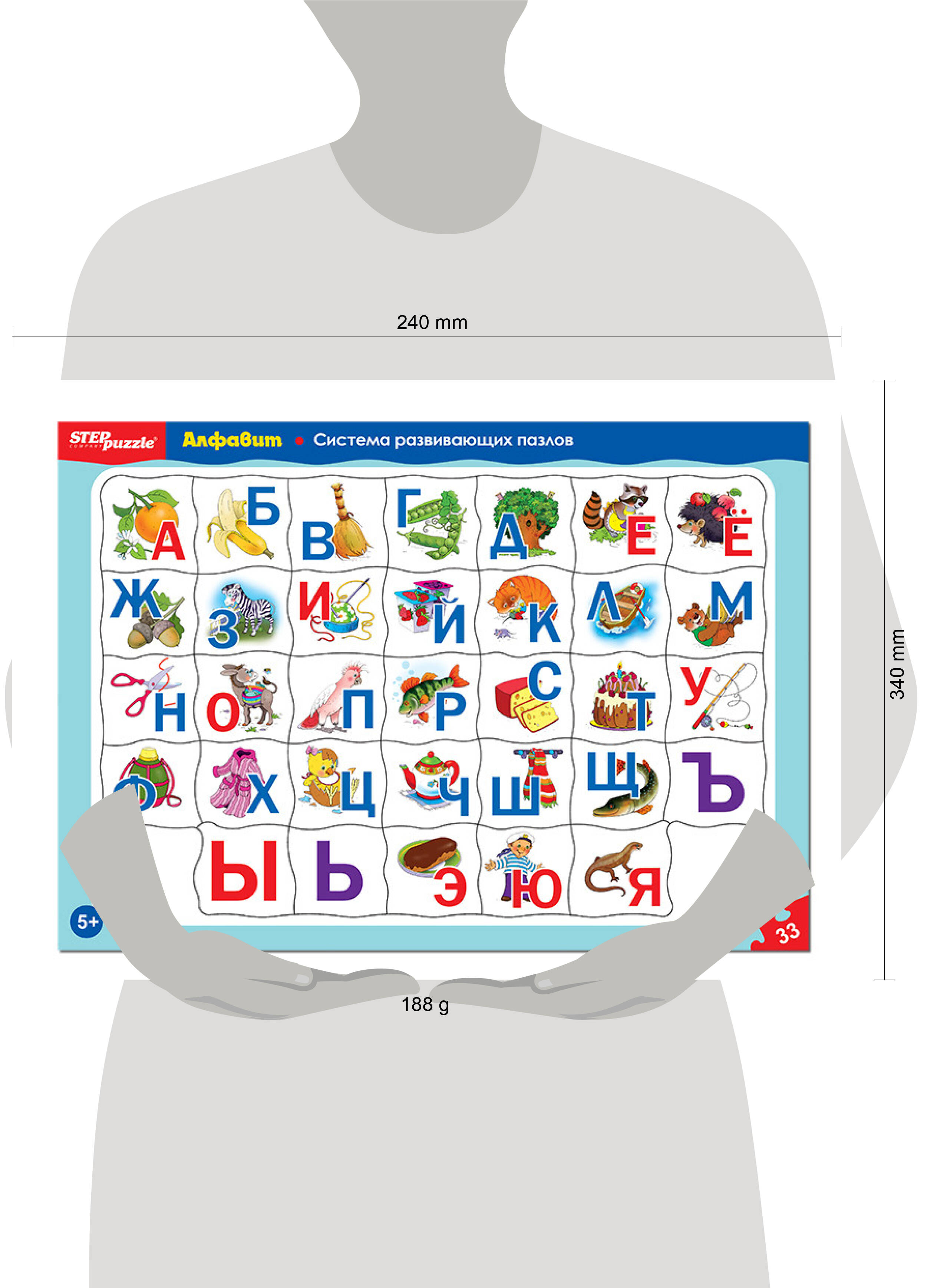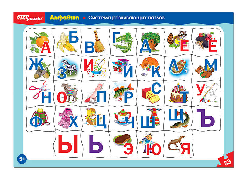 Развивающий пазл "Алфавит" ориентирован на активное развитие речи, памяти, внимания, логического и образного мышления. Эта игра поможет ребенку быстрее выучить буквы и некоторые новые слова. Характеристики игры: - яркое изображение; - размер детали 4,5 х 4 см; - размер игрового планшета - 34 х 24 см; - толщина игры - 2 мм; - безопасные, экологически чистые, нетоксичные материалы; - дизайн игры продуман с учетом детского восприятия, способствует концентрации внимания на выполняемом задании. Что входит в состав игры? - рамка-основа; - 33 пазла-вкладыша. В комплекте три игры: - Рассмотрите пазл и назовите буквы, с которых начинаются слова на картинках. - Переверните пазл, обведите по пунктирным линиями каждую букву, гласные раскрасьте красным цветом, согласые - синим. - Переверните планшет, отгадайте кроссворд и придумайте предложения с выделенными словами, в качестве подсказки используйте картинки на пазлах. Материал. Картон. Возраст игроков: Игра для детей от 5 лет. Помогите ребенку выучить буквы с пазлом "Алфавит". В этой серии: - Развивающий пазл "Ферма" - Развивающий пазл "Подводный мир" - Развивающий пазл "Цифры, формы и цвета"| Издательство | Степ Пазл ЗАО |