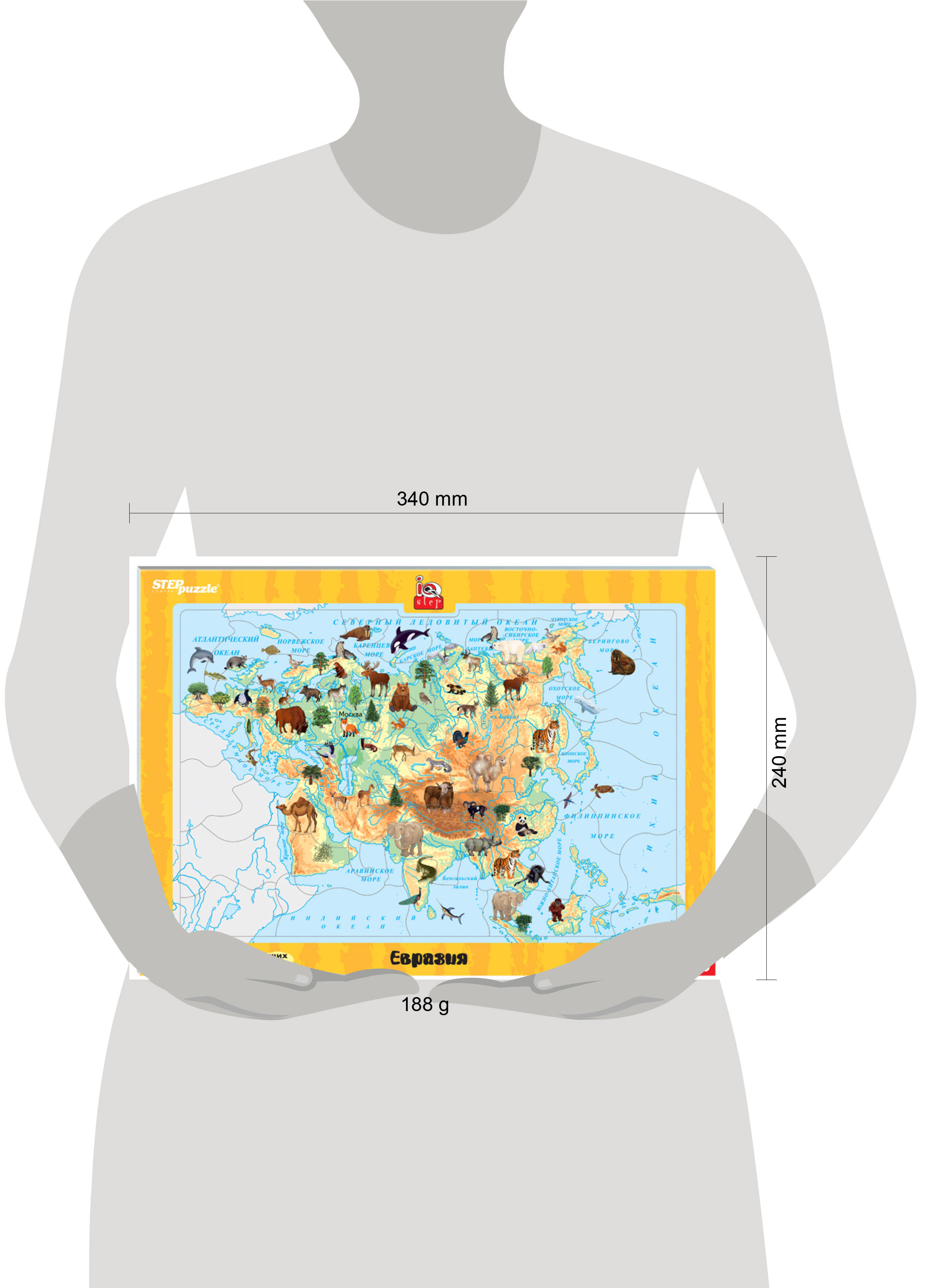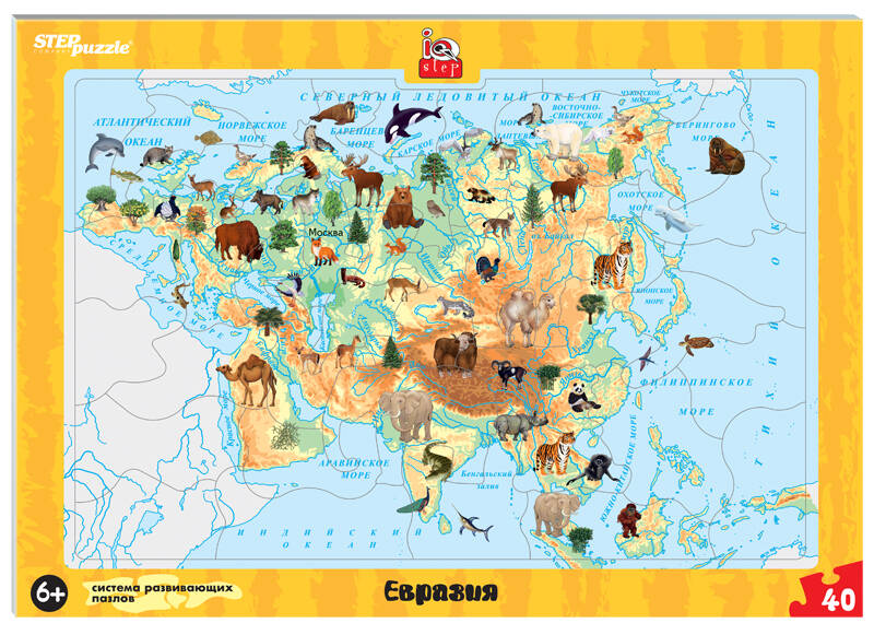 Развивающий пазл "Евразия" ориентирован на активное развитие речи, памяти, внимания, логического и образного мышления. Пазл интересен тем, что некоторые его детали необычной формы. Они сделаны в виде фигур - например, ребёнок сможет разглядеть тут медведя или морского котика. Всего пазл состоит из 40 деталей. На обороте планшета написаны интеерсные факты о том, какие животные и растения есть в Евразии и чем ещё интересен этот континент.. Характеристики игры: - размер игрового планшета - 34 х 24 см; - толщина игры - 2 мм; - дизайн игры продуман с учетом детского восприятия, способствует концентрации внимания и развитию воображения. Что входит в состав игры? - рамка-основа; - 40 пазлов-вкладышей. Материал. Картон. Возраст игроков: Игра для детей от 6 лет. Пазл "Евразия" наверняка понравится детям и станет отличным учебным пособием.| Издательство | Степ Пазл ЗАО |