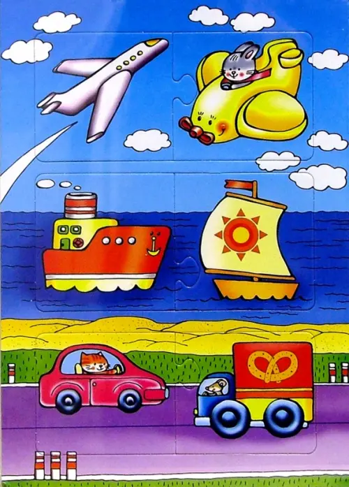 С разрезными картинками малыш научится подбирать подходящие по форме фрагменты рисунка и складывать их в целое изображение. Чтобы сложить картинку из нескольких частей, малышу нужно проявить сообразительность, терпение и настойчивость. Игры научат ребенка усидчивости, умению доводить начатое дело до конца, помогут развить внимание, память, образное и логическое мышление, сенсорно-моторную координацию движения рук. Разная величина и форма собираемых элементов картинки способствуют развитию мелкой моторики, которая напрямую влияет на развитие речи и интеллектуальных способностей. В дальнейшем хорошая координация движения рук поможет ребенку легко овладеть письмом. Элементы мозаики выкладываются на рамку, которая поможет малышу видеть, что он делает правильно, а над чем надо еще подумать. Контуры деталей собираемой картинки, повторяющиеся на рамке, позволят не ошибиться в подборе правильного элемента, а картинка-подсказка поможет справиться с заданием самостоятельно.