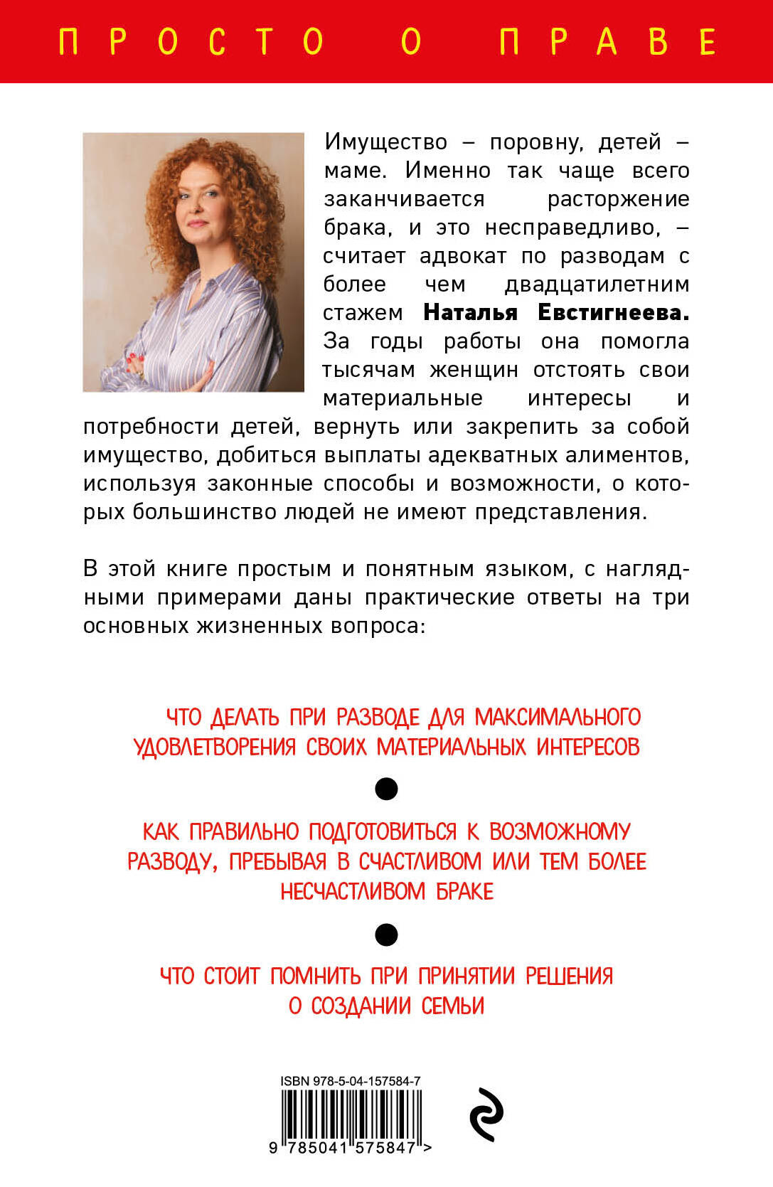 Имущество - поровну, детей - маме. Именно так чаще всего заканчивается расторжение брака, и это несправедливо, - считает адвокат по разводам с более чем двадцатилетним стажем Наталья Евстигнеева. За годы работы она помогла тысячам женщин отстоять свои материальные интересы и потребности детей, вернуть или закрепить за собой имущество, добиться выплаты адекватных алиментов, используя законные способы и возможности, о которых большинство людей не имеют представления. В этой книге простым и понятным языком, с наглядными примерами даны практические ответы на три основных жизненных вопроса: - что делать при разводе для максимального удовлетворения своих материальных интересов - как правильно подготовиться к возможному разводу, пребывая в счастливом или, тем более, в несчастливом браке - что стоит помнить при принятии решения о создании семьи| Издательство | ООО "Издательство "Эксмо" |